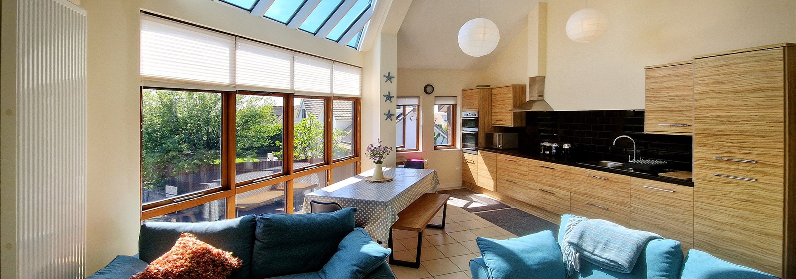 The heart of Coast lies in its attractive vaulted ceiling kitchen. Bathed in natural light, this modern kitchen provides not only a well-equipped space for cooking up a storm but also comfortable seating to unwind after a day spent on the nearby beach. Sit back and enjoy your favourite shows on the Smart TV. A sofa is also provided in the spacious entrance hallway, offering another spot to relax. In a utility cupboard in the hallway will be found a convenient washing machine to take care of any laundry needs