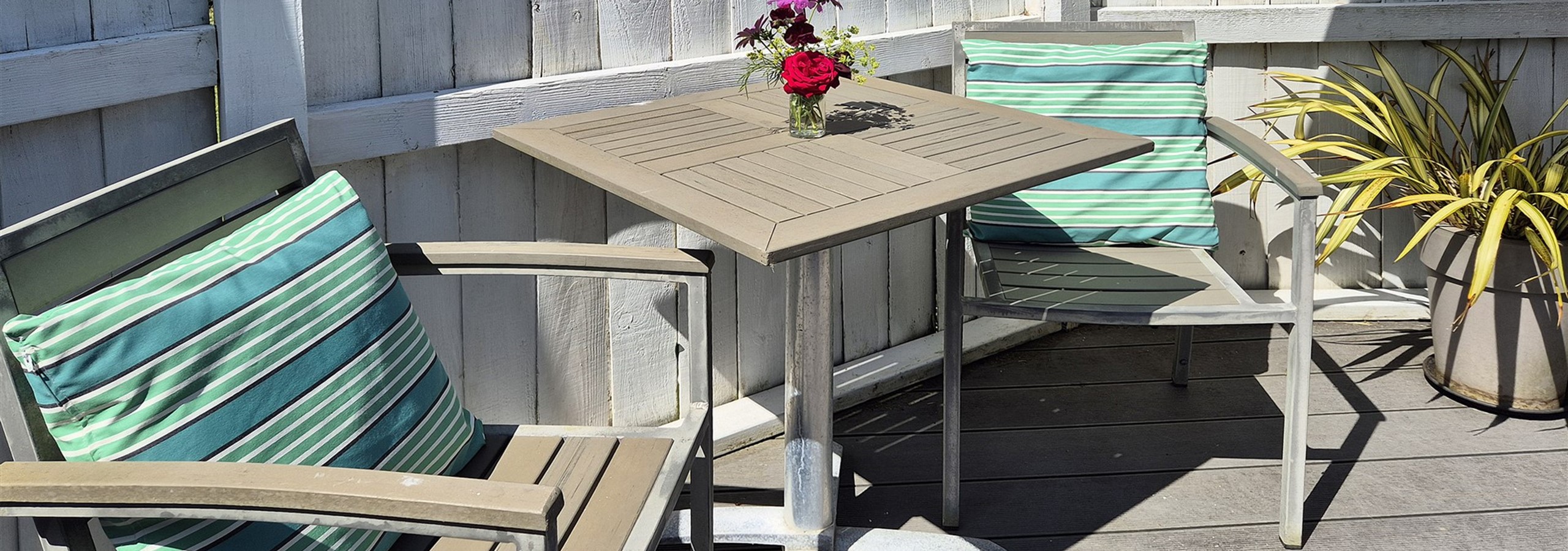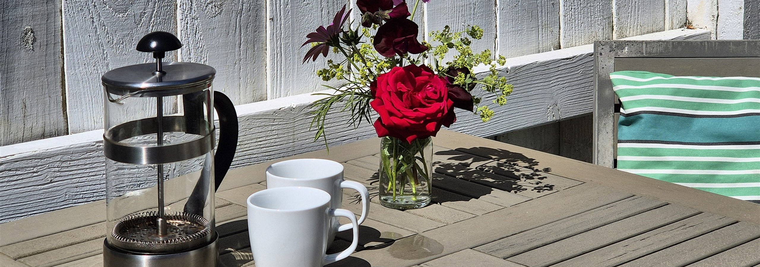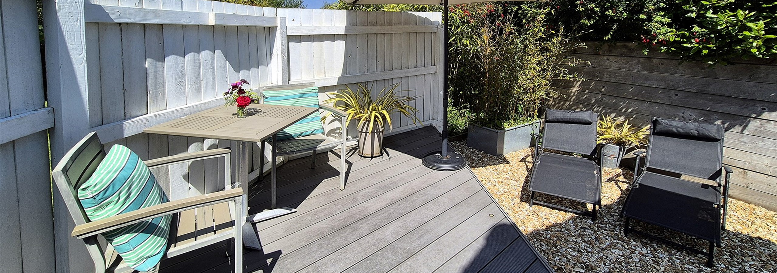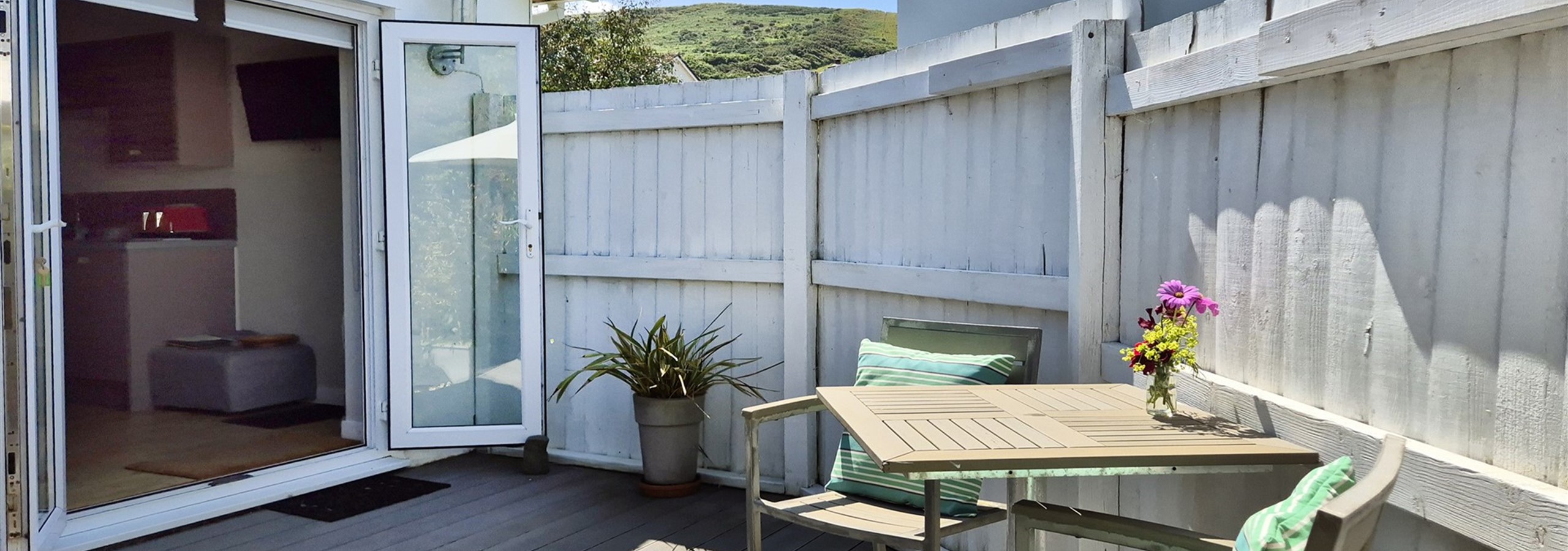 The open plan Kitchen/living/dining room has been thoughtfully arranged to maximise the space and offers everything you will need for a comfortable and enjoyable holiday. The kitchen area provides a dishwasher, cooker, hob, kettle and microwave. There is a dining table with 2 chairs and comfortable seating in the sitting area with TV and French doors leading out to the lovely decked terrace with table and chairs & BBQ for 'al-fresco' dining and sun loungers to enjoy during the summer months!