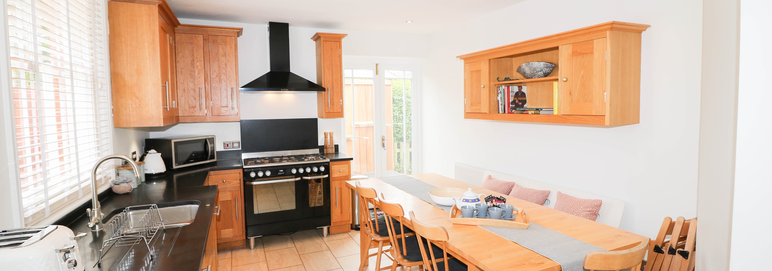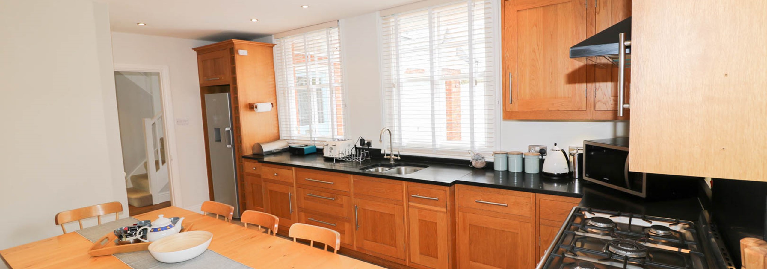 The kitchen/diner is well equipped with a large oven, hob, dishwasher, an american style fridge freezer and a dining table with chairs seating up to 10 guests. French doors lead out to the side of the property.