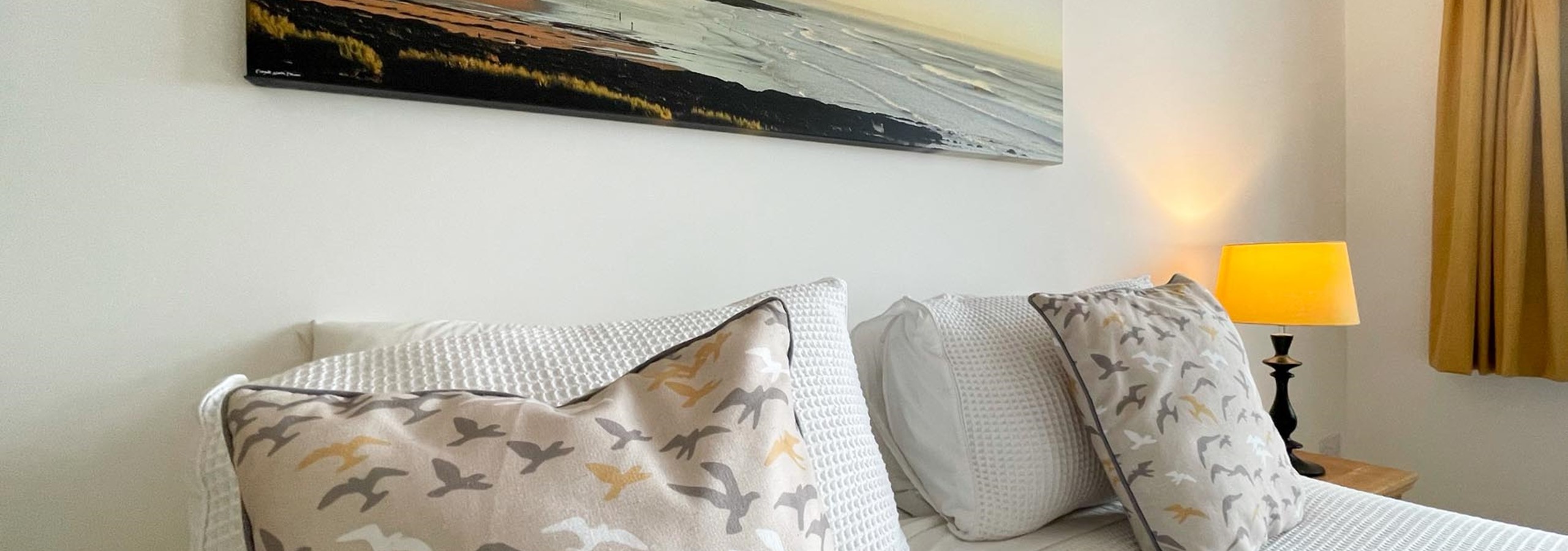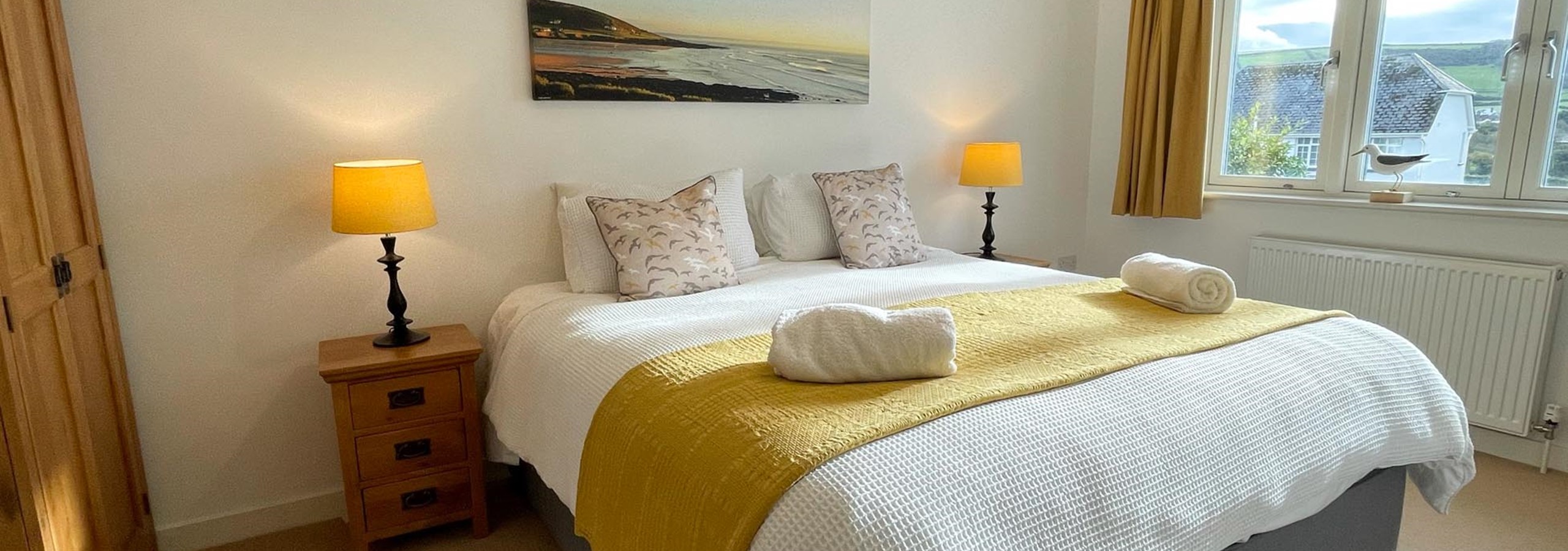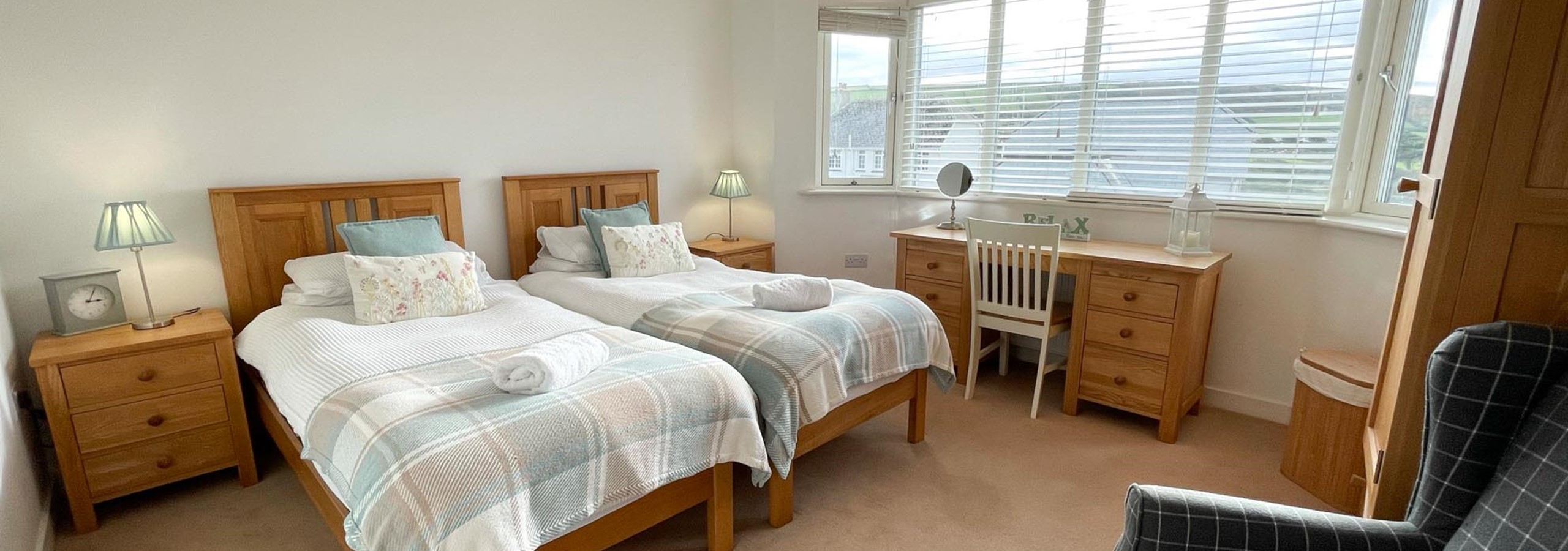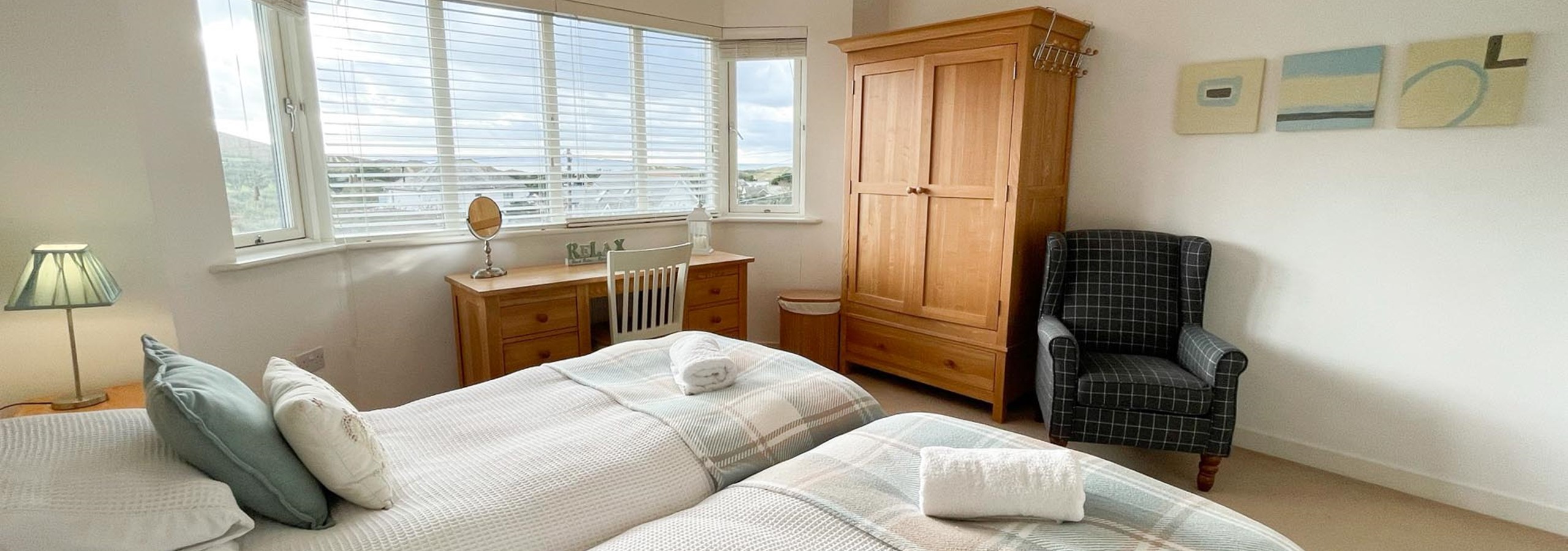 There are 4 bedrooms sleeping up to 10 guests. The master bedroom has zip and link beds which can be arranged as two singles or a king size bed. There are lovely views to the front across the dunes and out to sea, plenty of clothes hanging & storage and a good sized en-suite bathroom with shower over the bath.