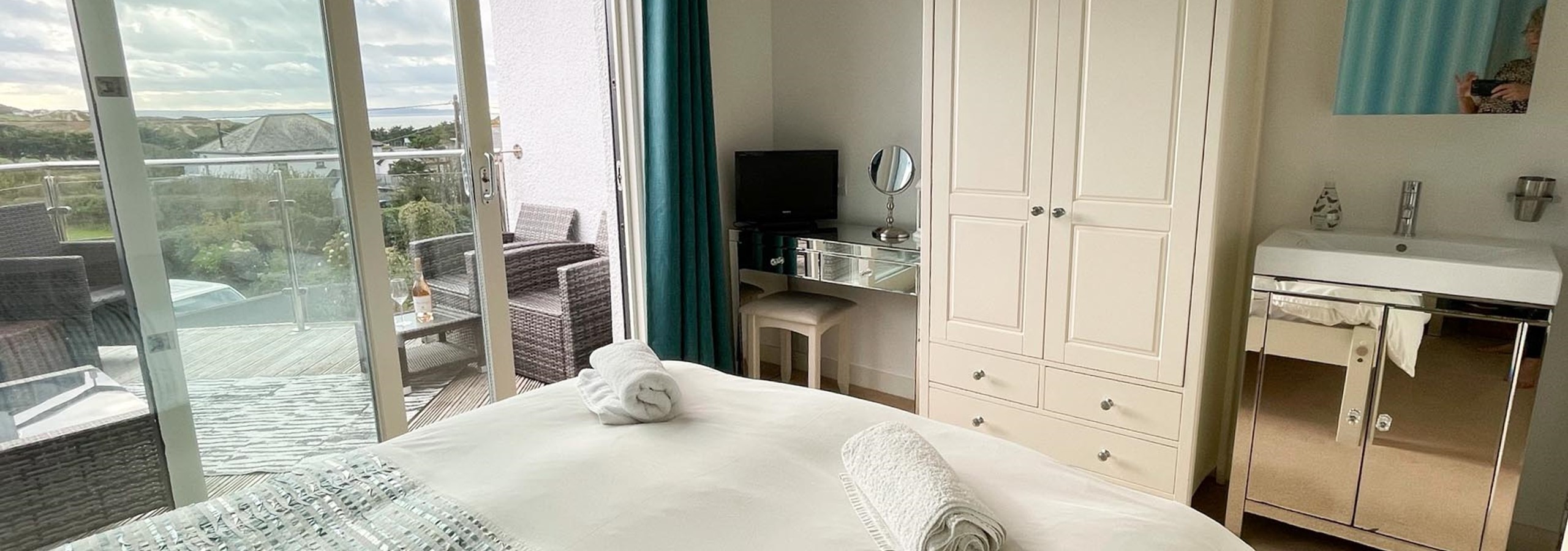 Bedroom 4 is a wonderful room with king size bed, sink unit and fantastic 'sea view cocktail balcony' which has rattan seating for up to 8 people. This is a wonderful spot to enjoy a morning coffee or an evening drink whilst watching the sun set.