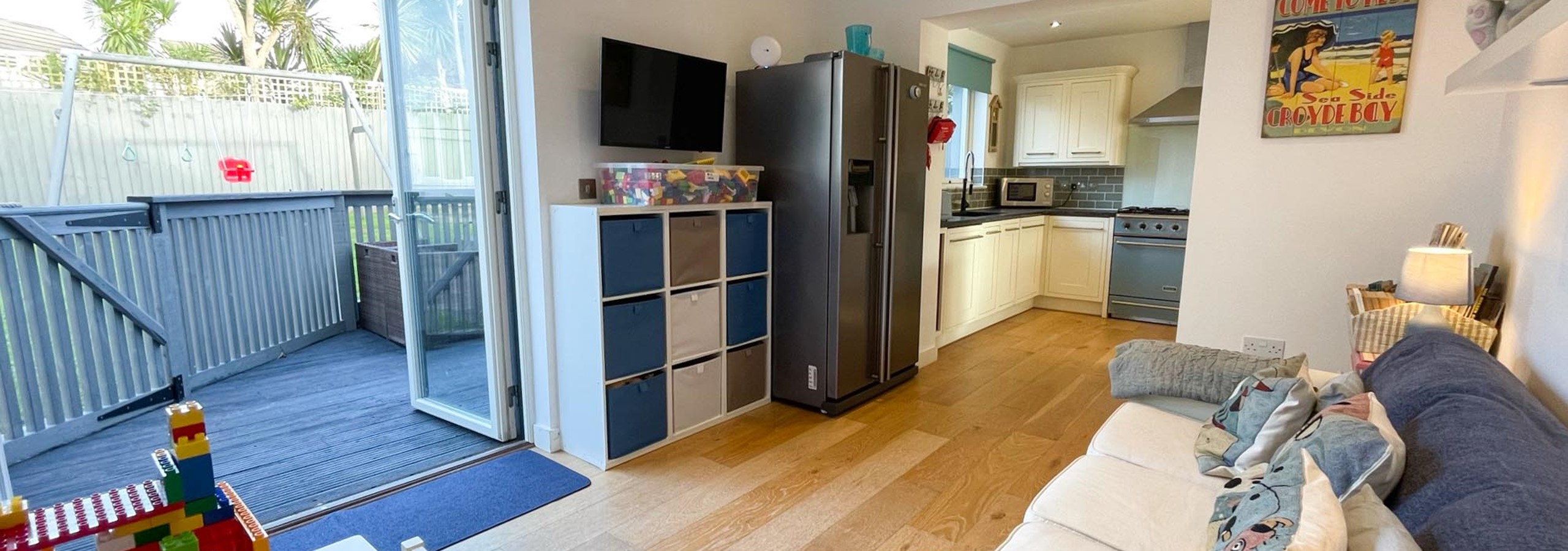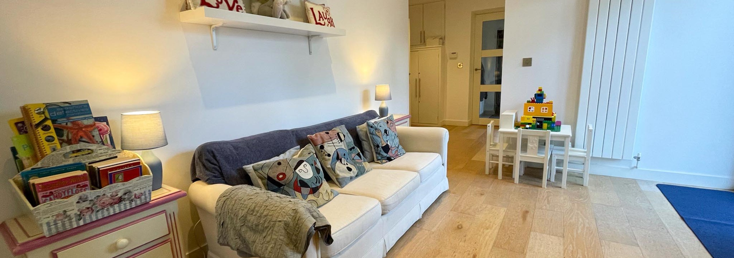 The children's living/playroom is open to the kitchen meaning you can keep an eye on the little ones whilst cooking. There is a small sofa and plenty of books, games, toys and Lego as well as a wall mounted smart tv to keep the little ones entertained! French doors lead out to the secure gated rear deck with wendy house and onto the lawned garden.