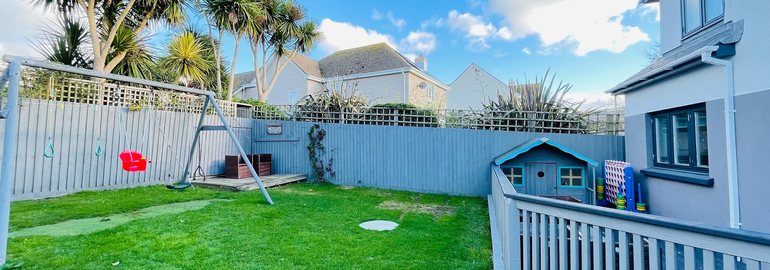 To the rear of the property, there is a further lawned garden area where there is a swing for children (must be supervised at all times and used at own risk). The garden is not fully enclosed therefore children and dogs should be supervised at all times. The enclosed, decked area (also accessed from the playroom) has a wendy house, outdoor toys and a children's rattan table and chair set making this a great feature for families.
