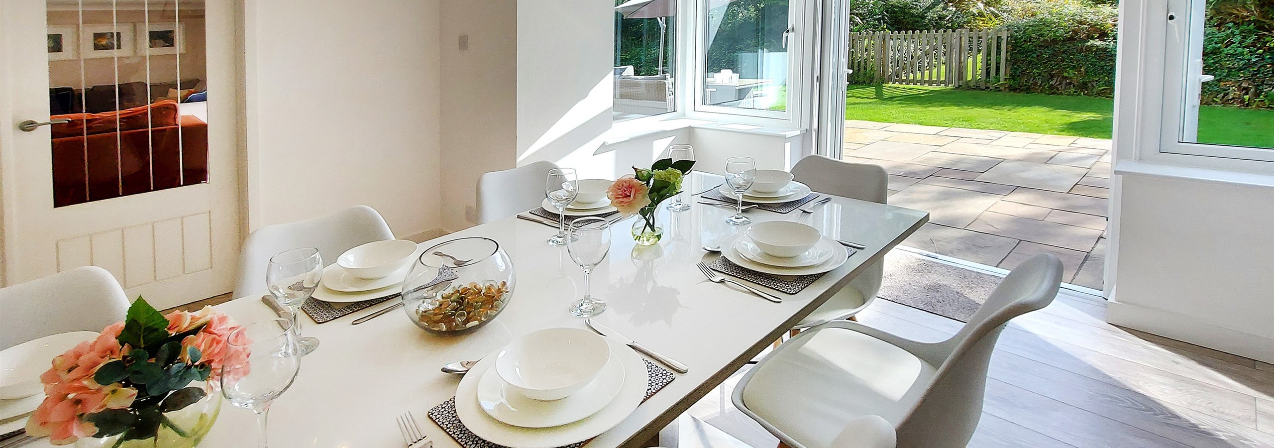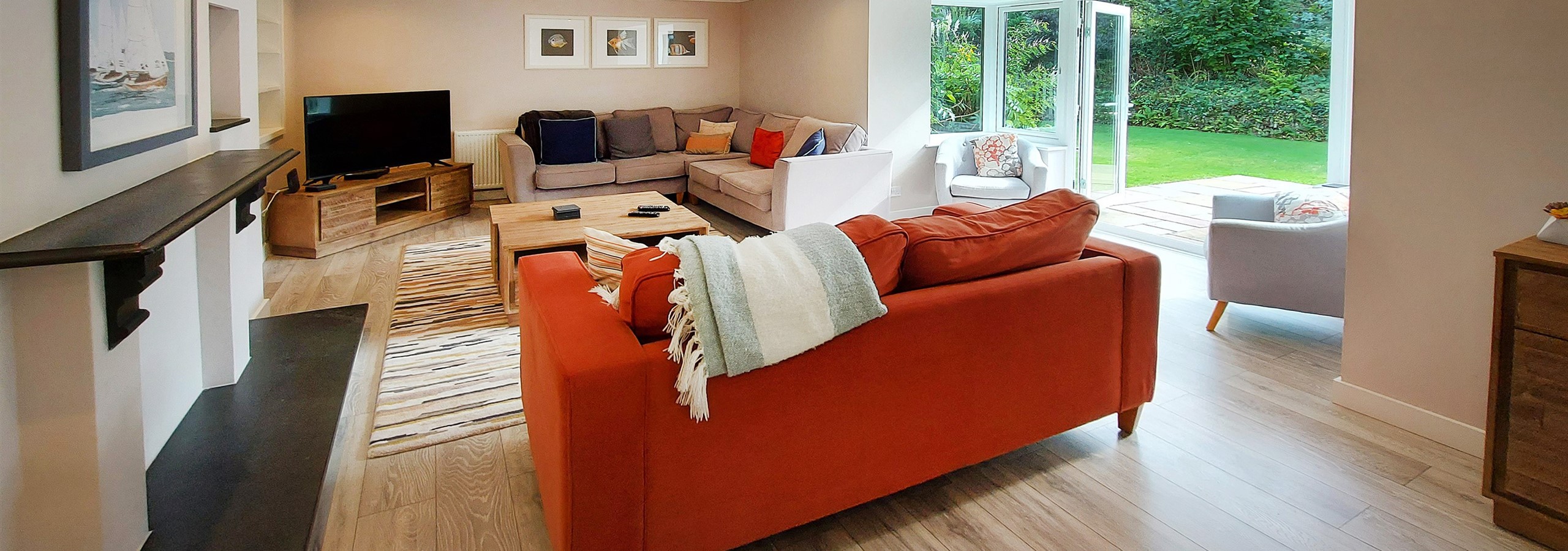 A set of double doors lead between the dining room and the living space which can also be accessed off the large entrance hall. Comfortable seating for all guests can be found in the lounge, a smart TV is available for entertaining. A further set of patio doors lead from this room onto the patio space.