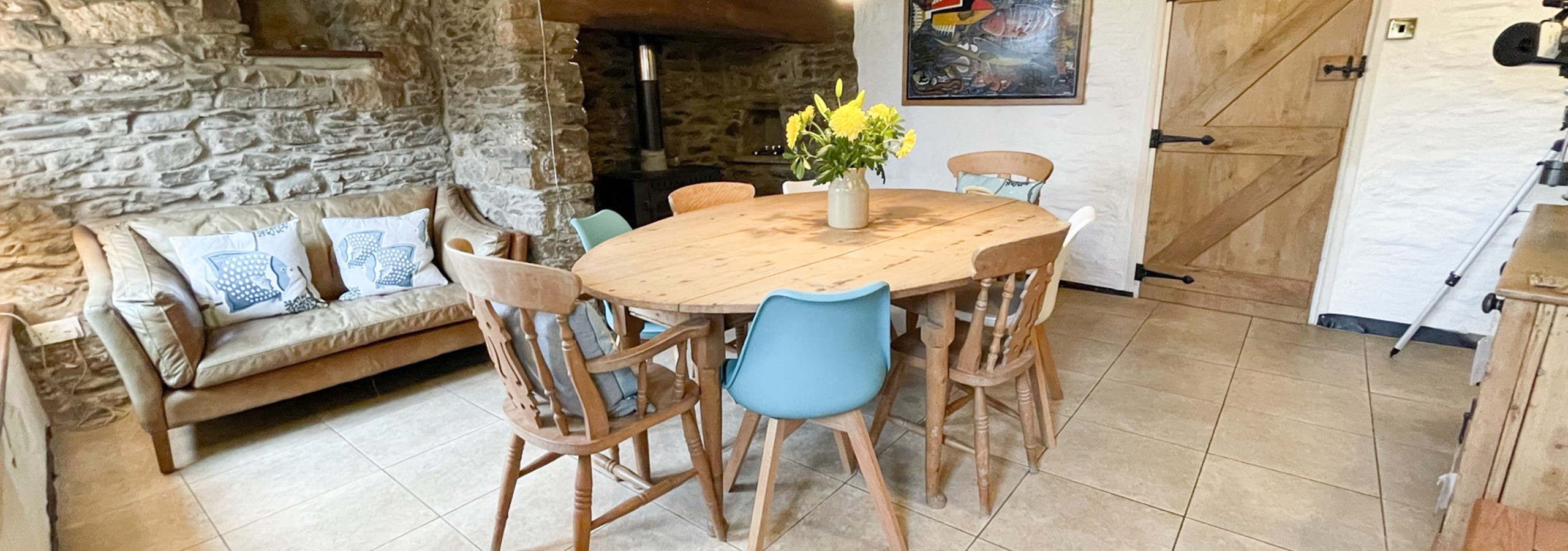 The dining room is full of wonderful character features such as a large Inglenook fireplace with log burner, original beams and stone walls. A large, round dining table with seating for 8-9 people provides a great setting for family meals and evening games and entertainment.