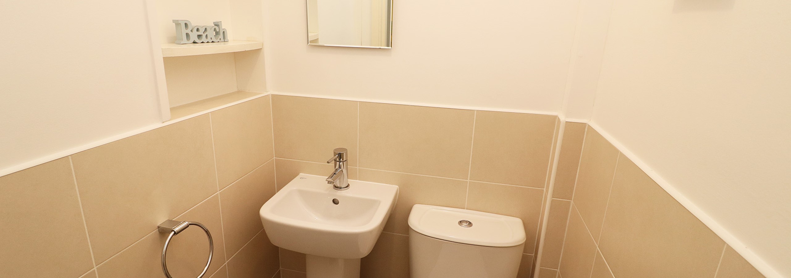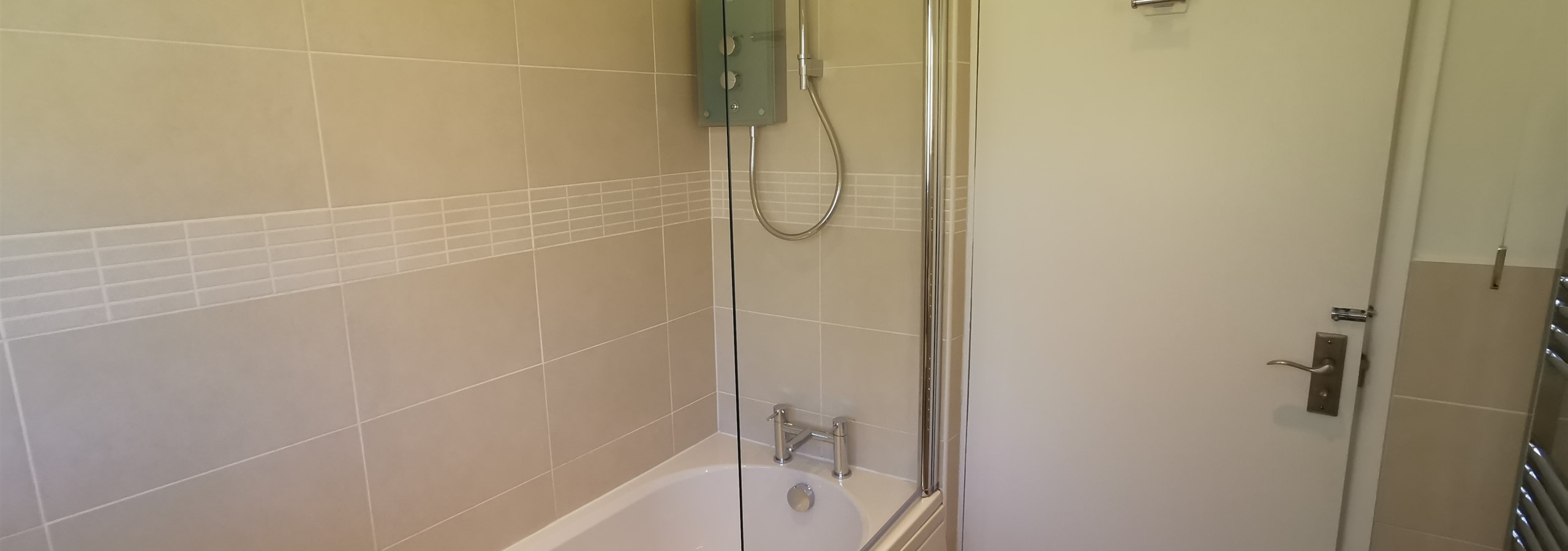 Family bathroom with shower over bath, wash basin and WC, plus a separate WC.