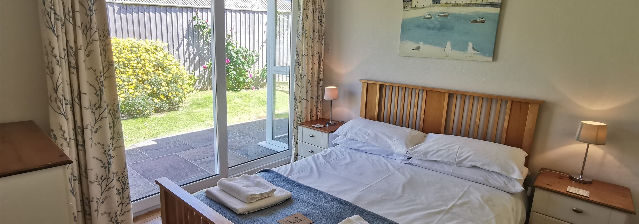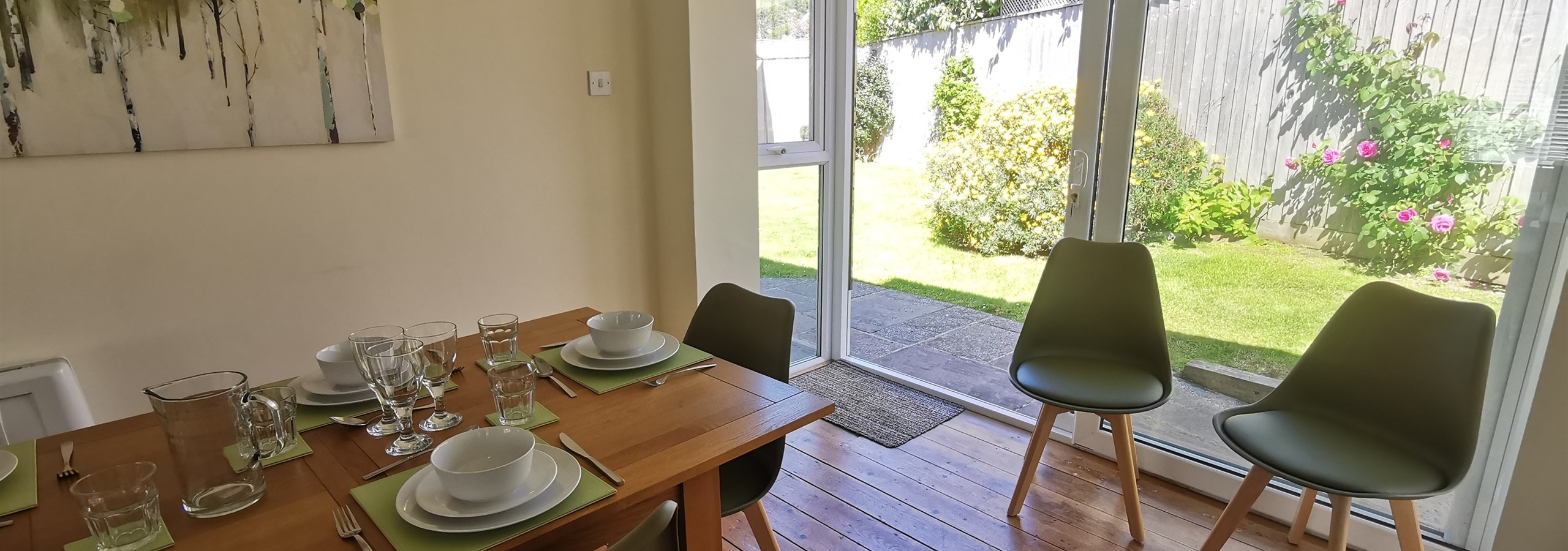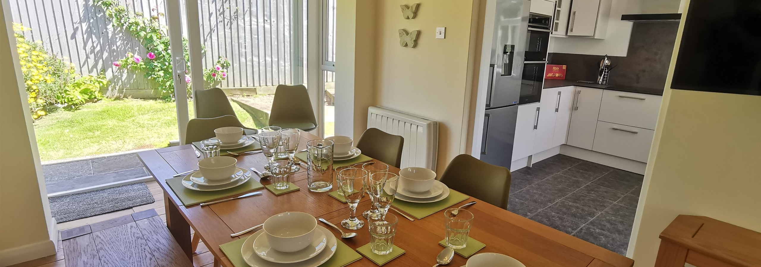 The property has an open plan kitchen/dining/living room with French doors opening out to the enclosed garden (ideal for BBQ's), well equipped kitchen with dishwasher, washing machine & microwave. There is a dining room with table and chairs for 6 people. The living room provides comfortable seating plus a flat screen TV with Freeview.
