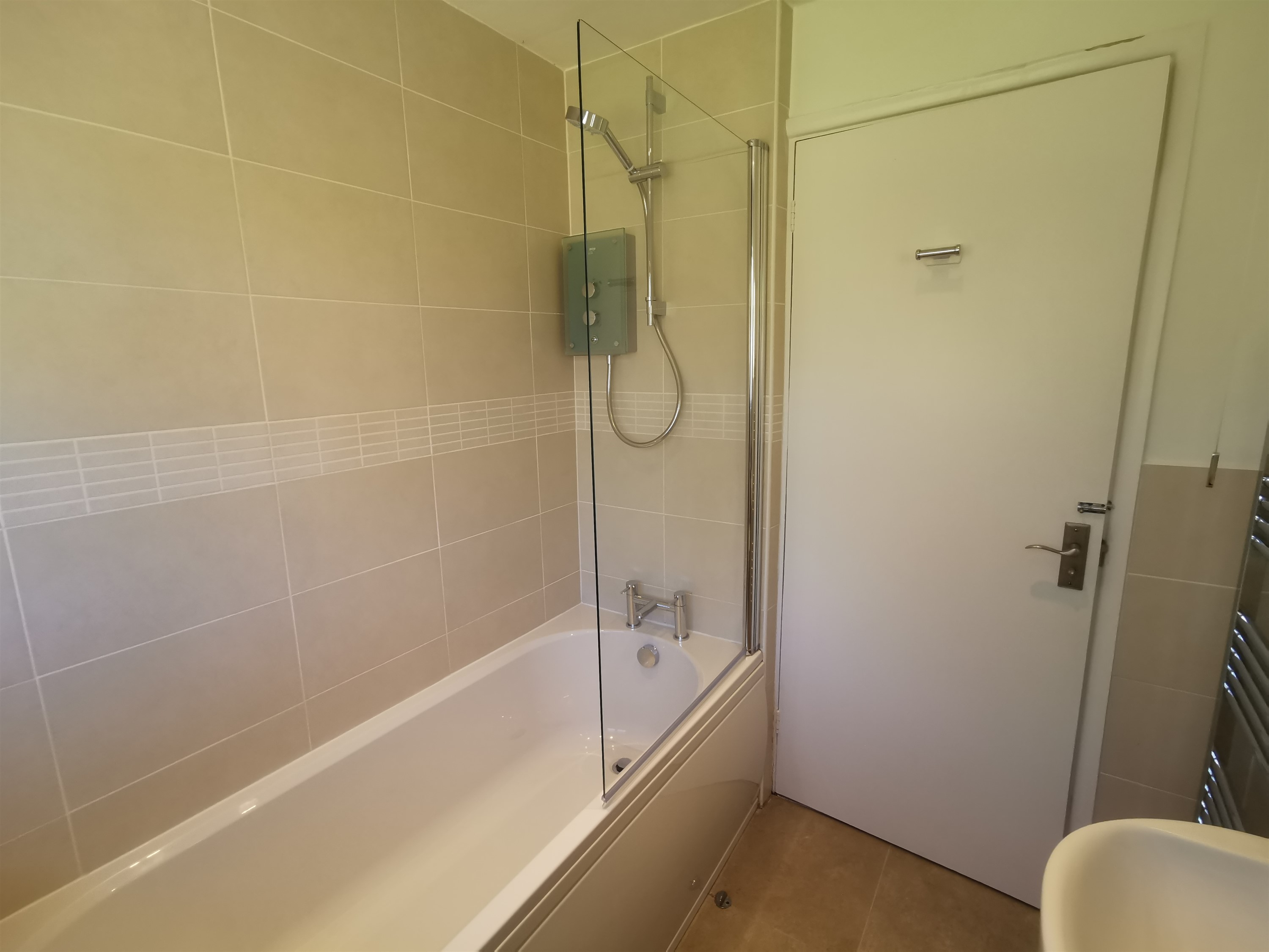 Family bathroom with shower over bath, wash basin and WC, plus a separate WC.