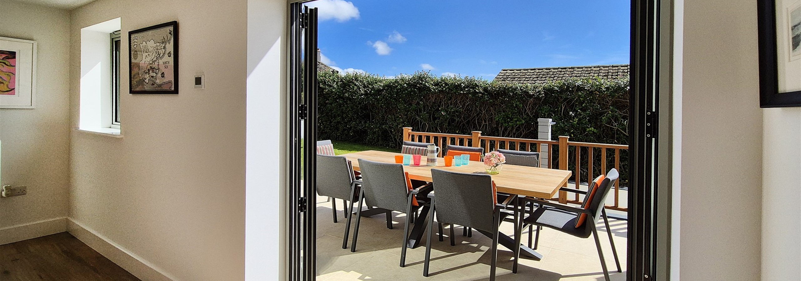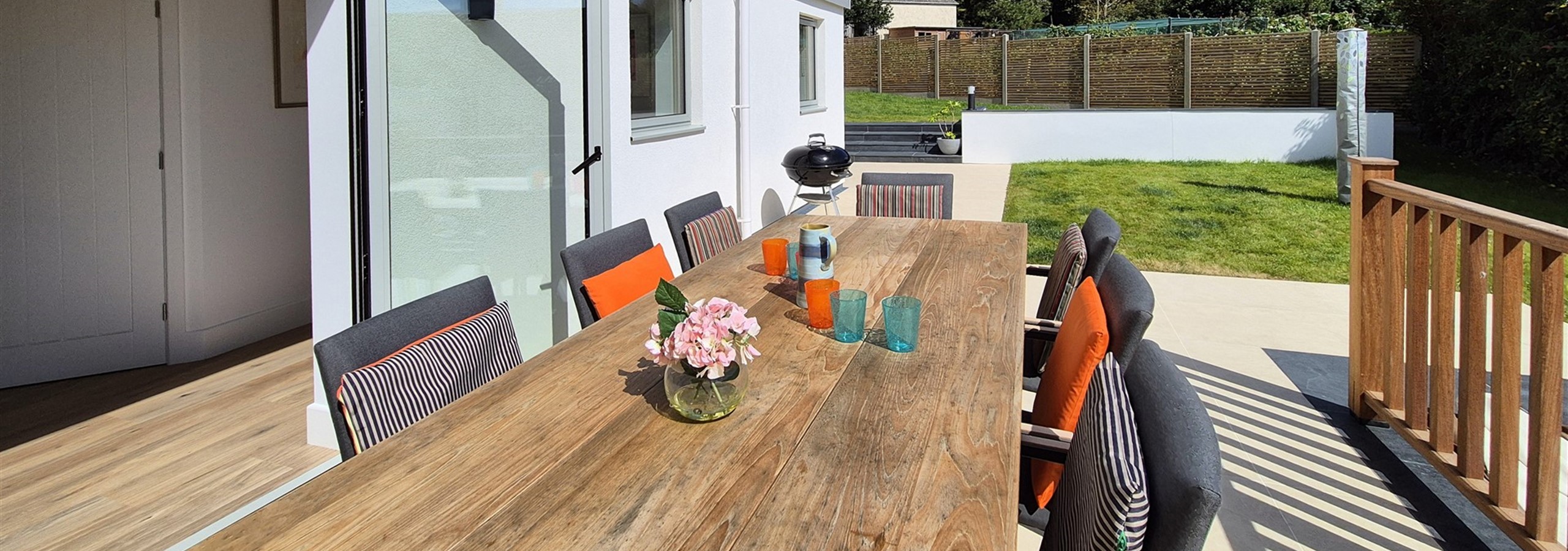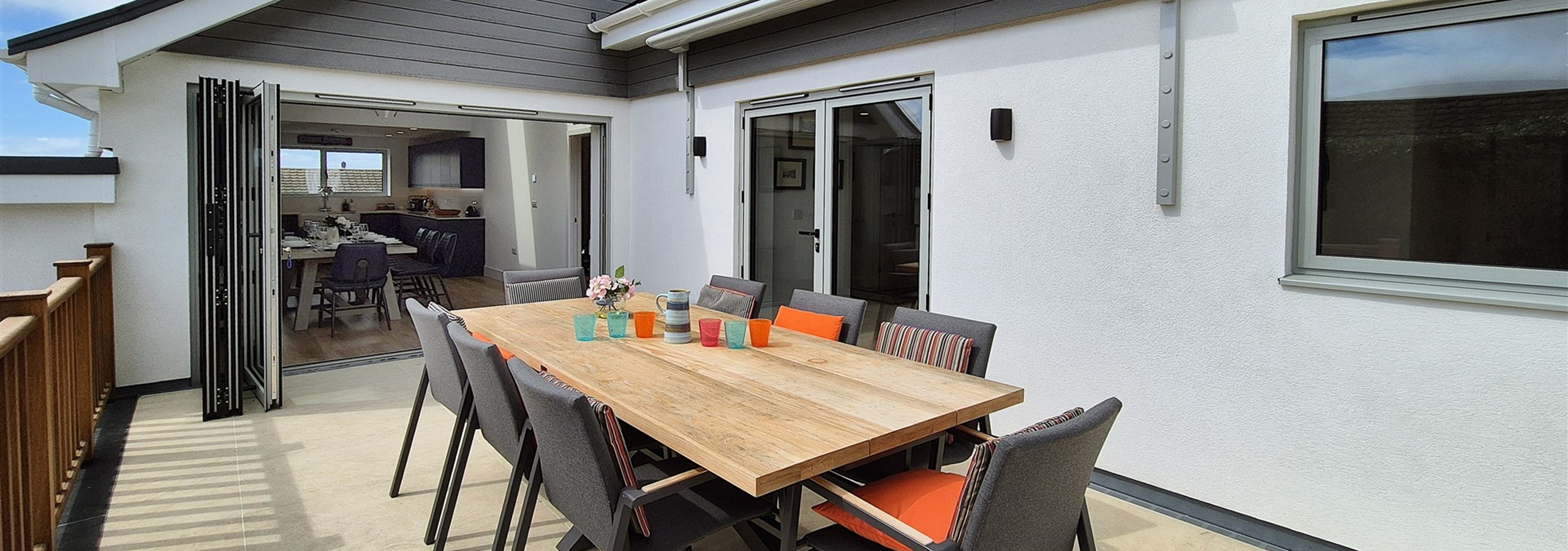 There is an attractive kitchen/diner, where contemporary design meets functionality. This space is ideal for family meals and entertaining. Bifold doors in the dining area open onto a outdoor seating area complete with retractable awning, perfect for al fresco dining.