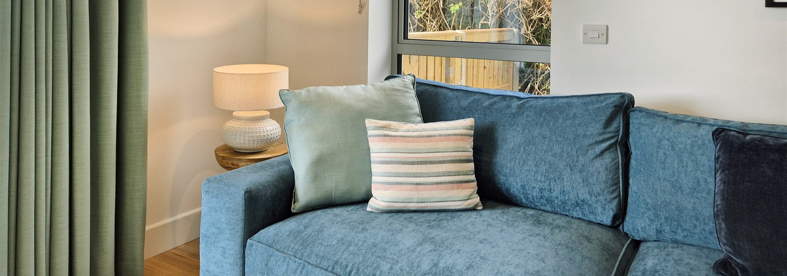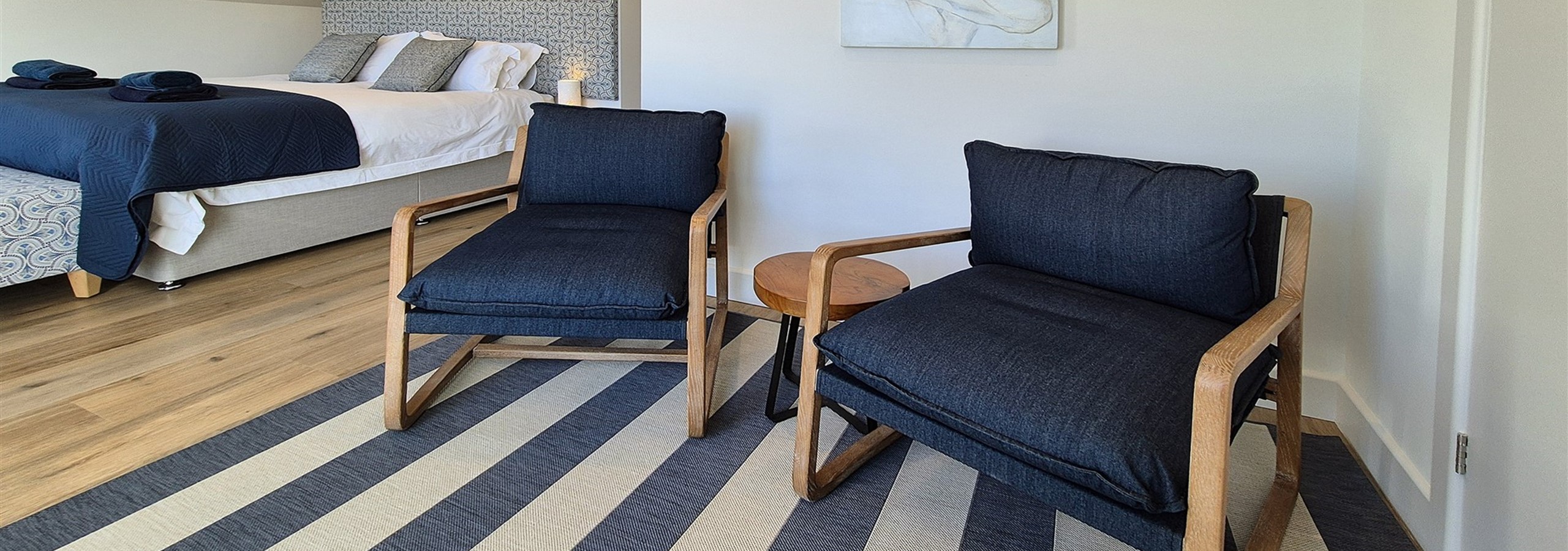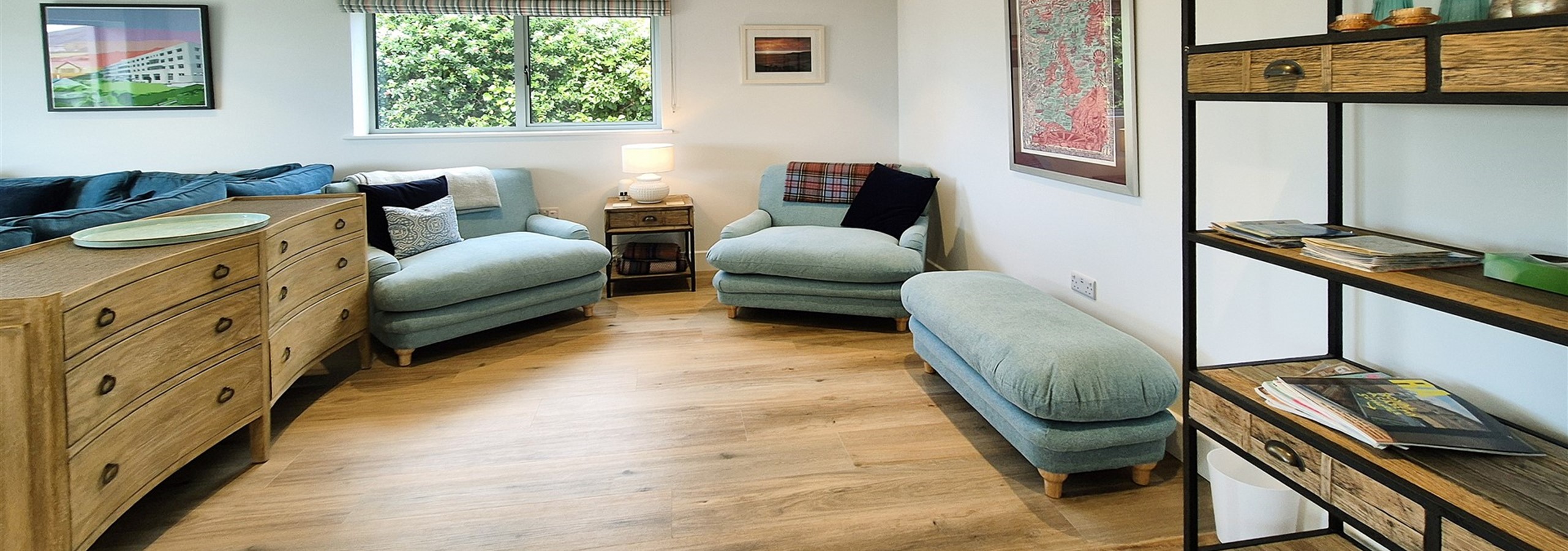 The generously sized lounge is the perfect gathering space, offering ample room for relaxation with a large L-shaped sofa and two cozy chairs.