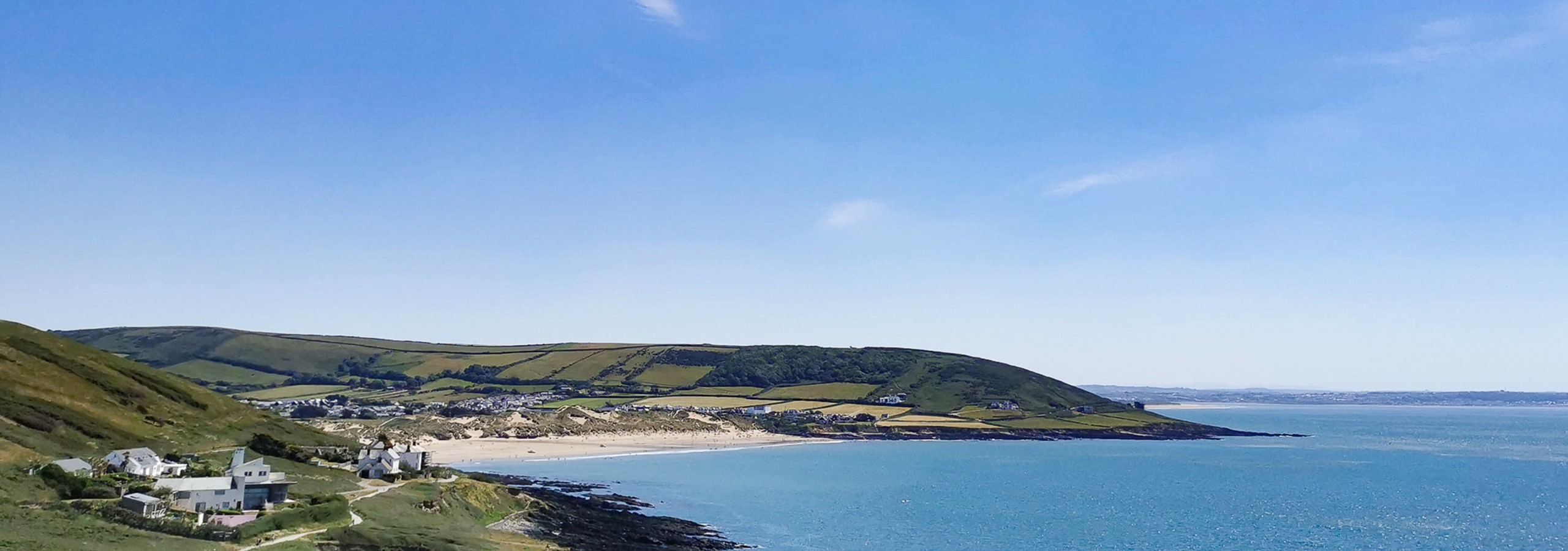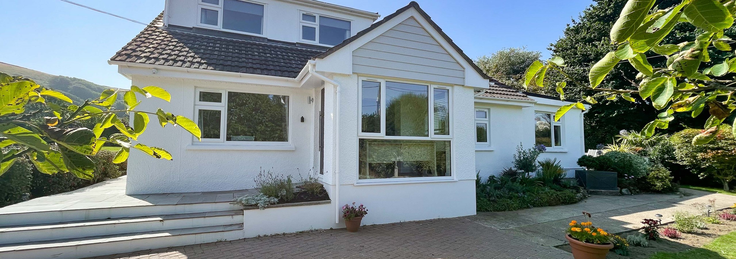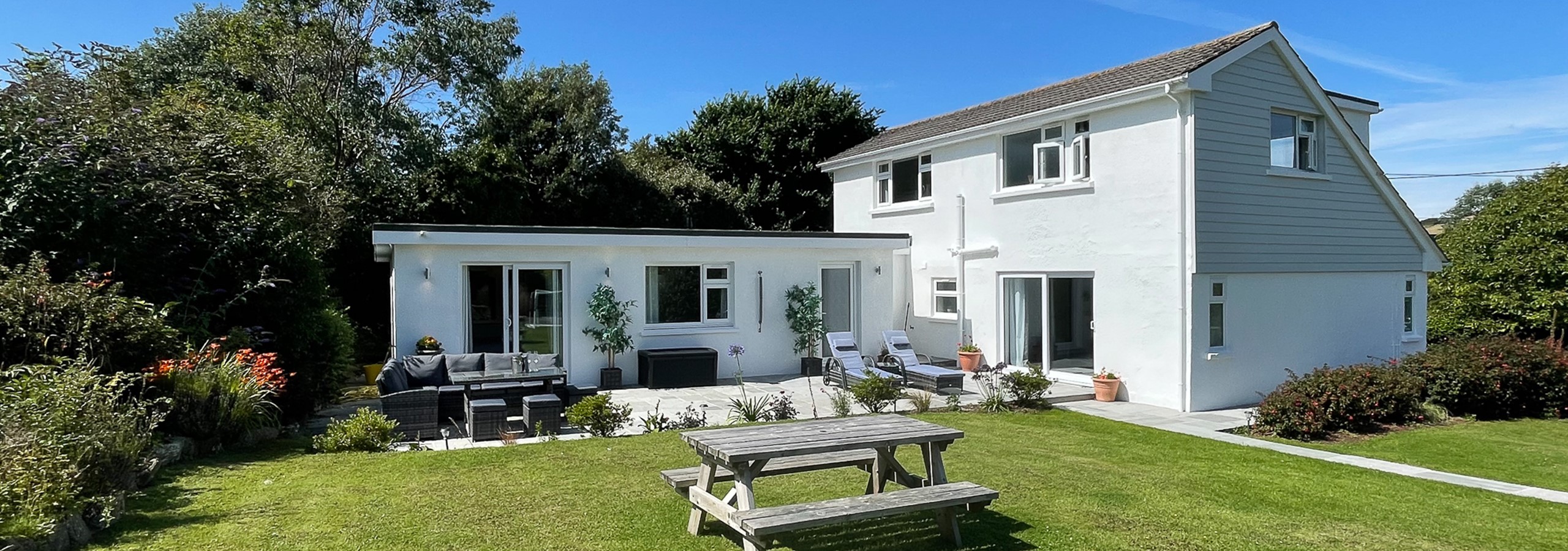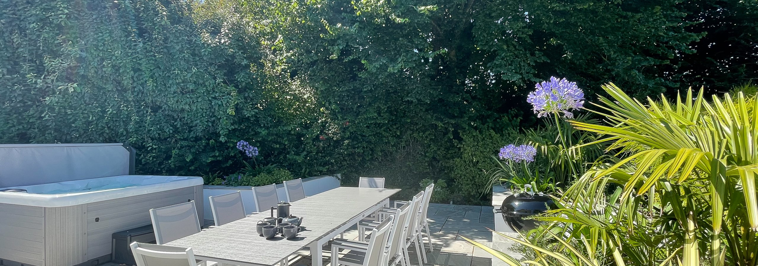 The WOW factor of Sea Whisper is not just limited to the inside - the landscaped terraces and gardens have been transformed to provide fantastic areas to relax and wile away the days yet also with plenty of garden space for children to run around and enjoy the fresh sea air! The gated driveway provides parking for multiple vehicles and the garden is fully enclosed when the gates closed. A brand new terrace and borders have been built to create a Mediterranean villa style area off the living/dining room and this is where the hot tub is located together with the large outdoor table and chairs and Weber coal BBQ. This terrace leads around to the wetsuit washing/drying area outside the utility room where there is a sturdy rail with hangers available to dry wetsuits and surfboards/bikes can also be stored in this area. The path continues around the back of the property to the second, newly laid terrace where there is more informal seating with corner sofa, table and stools plus 2 sun loungers. Being predominantly south-east facing, this terrace is a real sun trap and the outside shower is ideal for cooling off in the heat or washing off the sand before heading into the wet room. From here, the lawned garden extends to the front of the property and is bordered by flowers, shrubs and mature trees. There is a pedestrian gate which leads onto Cott Lane - if you can tear yourselves away from this amazing property - where within a few minutes' walk you will reach the village amenities and an approximate 15 minute walk to the beach!