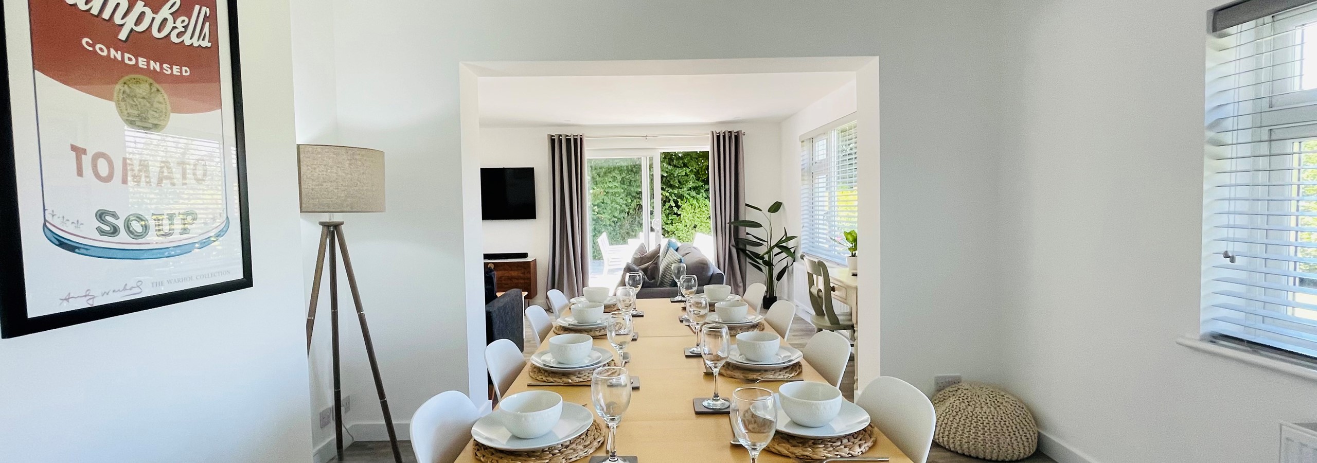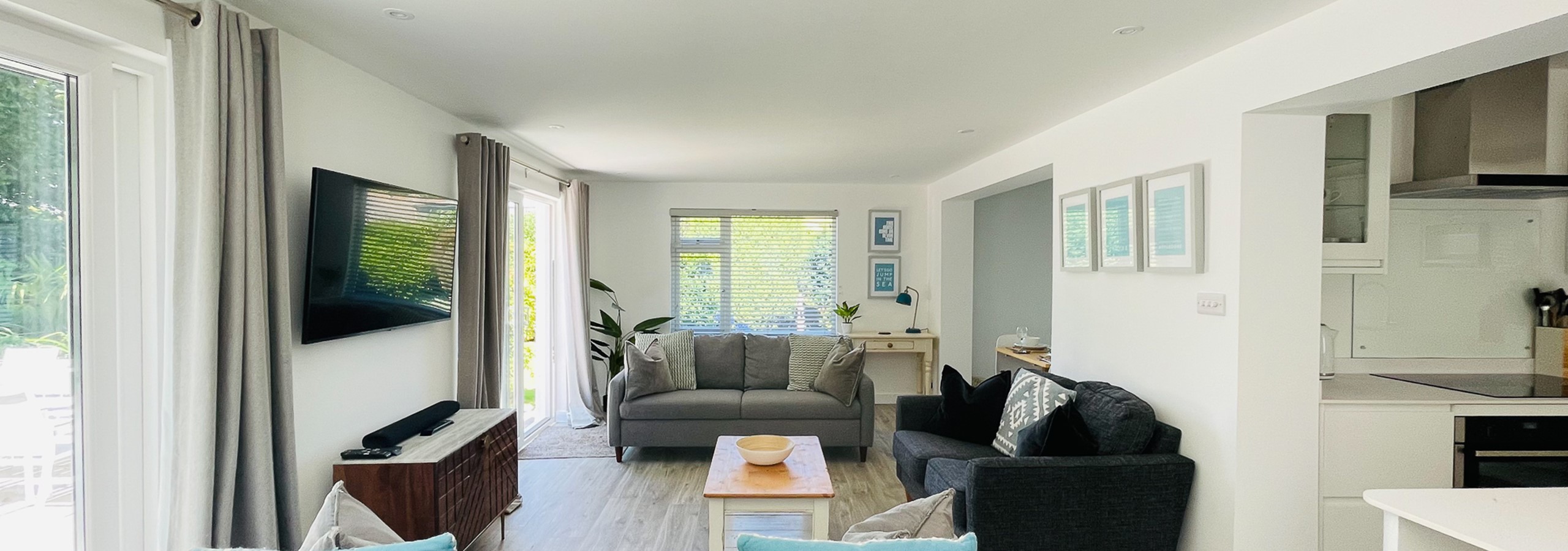 The main open plan living/dining room is the hub of the house and the perfect setting for everyone to get together for some evening entertainment. The dining table is extendable and will seat up to 12 people, there is a wall mounted smart TV with soundbar that can also be used as a Bluetooth speaker. There is comfortable seating for 8 - 9 in the living area and two sets of patio doors leading out to the newly created and landscaped terrace with BBQ area, large table and chairs and hot tub!