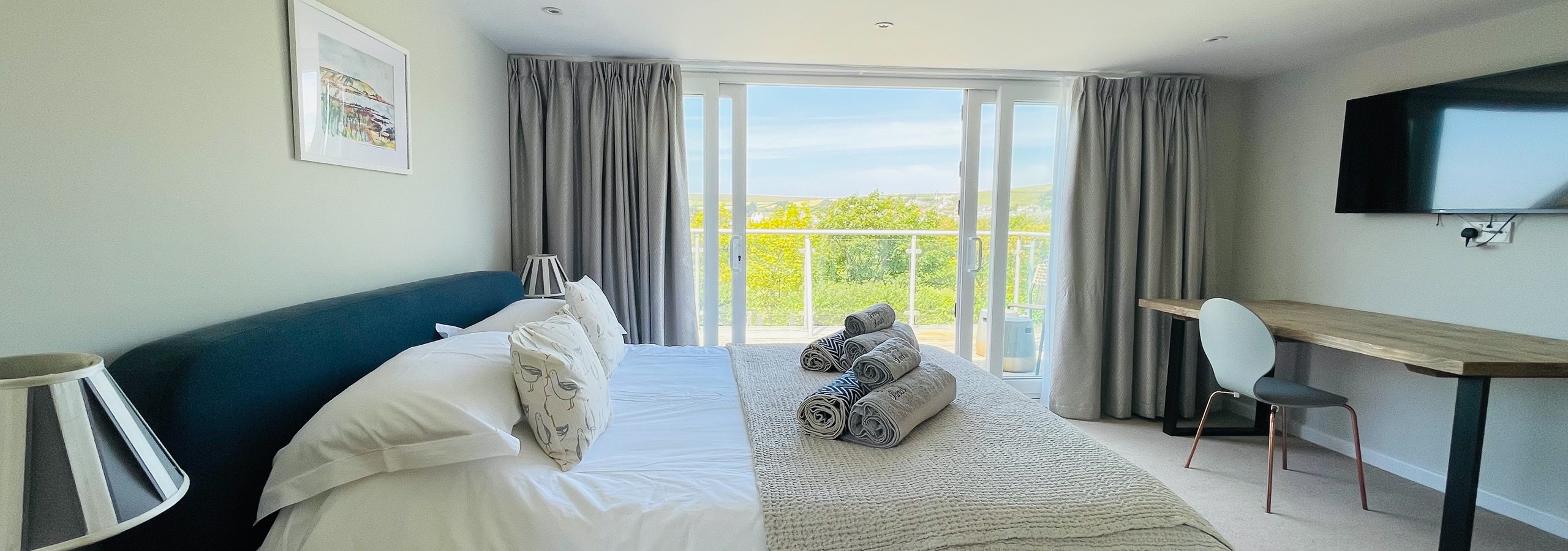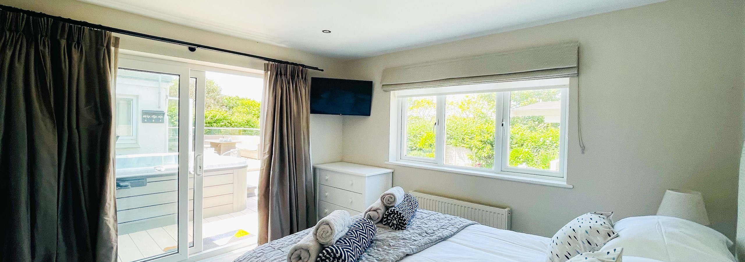 There are 5 bedrooms in total, two being on the ground floor which makes this property suitable for people with restricted mobility. Both ground floor bedrooms have king size beds, a smart tv and bedroom 2 benefits from an ensuite bathroom with shower over the bath and French doors leading onto the decked hot tub area and garden. A shower room to the ground floor services Bedroom 3. Upstairs there is a very spacious master bedroom with superking bed, large smart tv, with hanging space, desk/study area and bi-fold doors leading to a great balcony which is equipped with a rattan sofa set and enjoys views over the garden and across Croyde village towards the Dunes and surrounding countryside. The master bedroom also has an en-suite shower room. Bedroom 4 is a twin room (some restricted headroom) and bedroom 5 is a single. There is an option of a pull out trundle bed for an additional child if required, this can be added during the booking process.