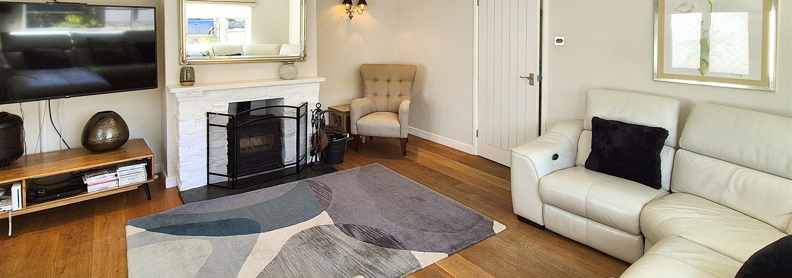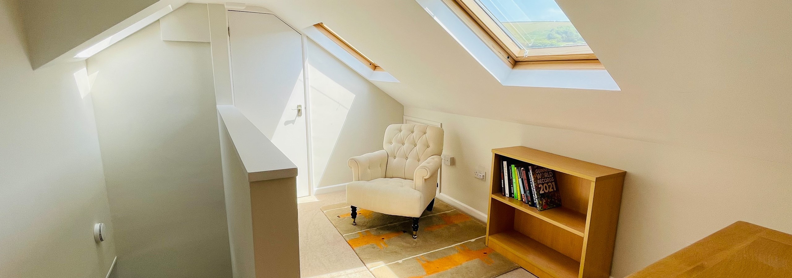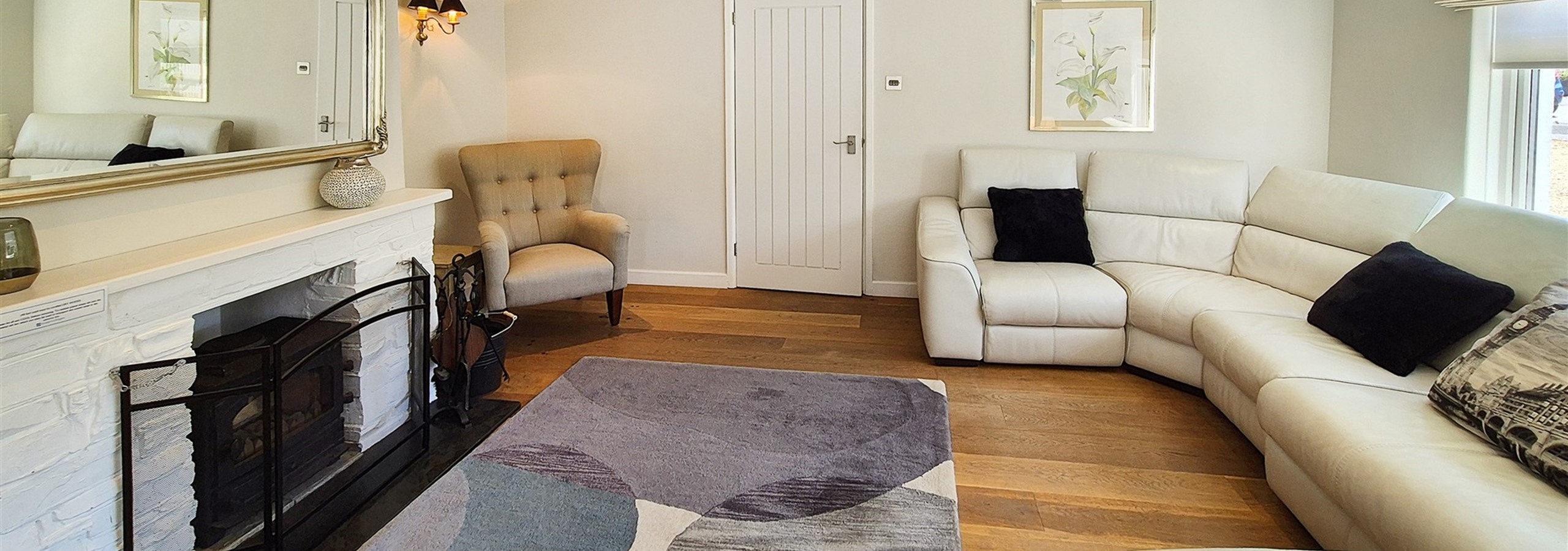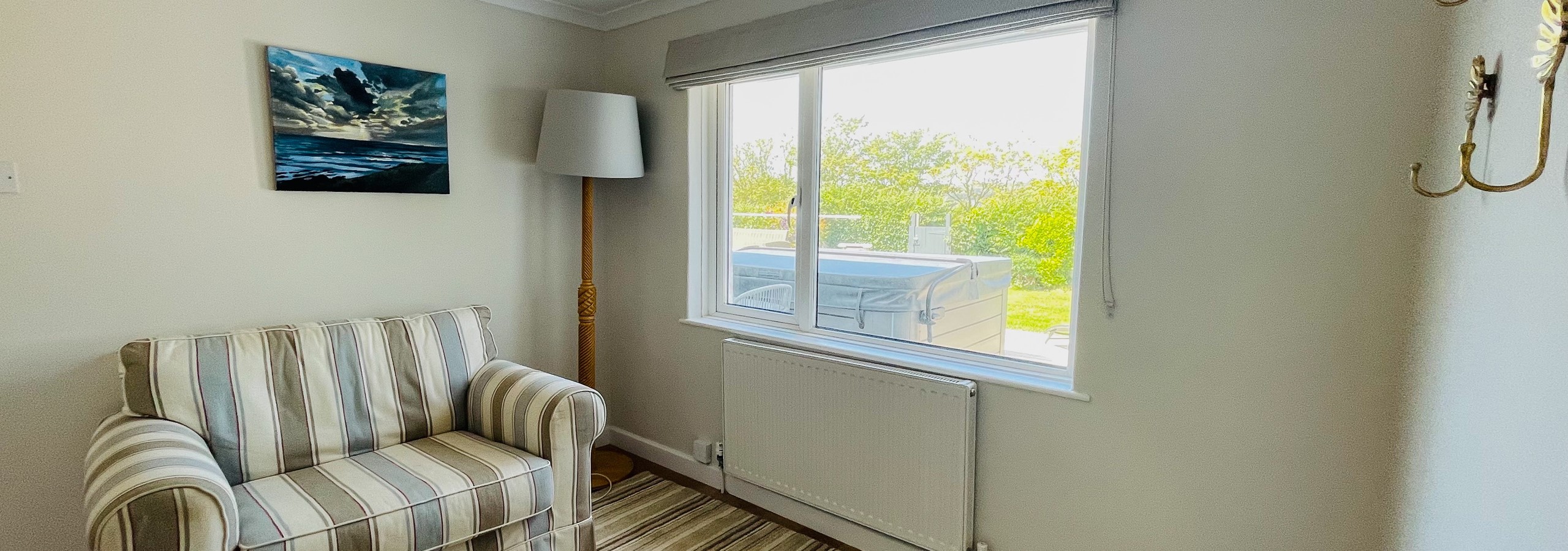 The spacious living room offers comfortable seating for 7 people and is equipped with a huge Smart TV. There is a lovely woodburning stove - perfect for cosy evenings after a long winter's walk! There are also two 'reading areas' one downstairs just off the hall with a cuddle chair and window overlooking the garden, the other at the top of the stairs where there is an armchair and bookcase.