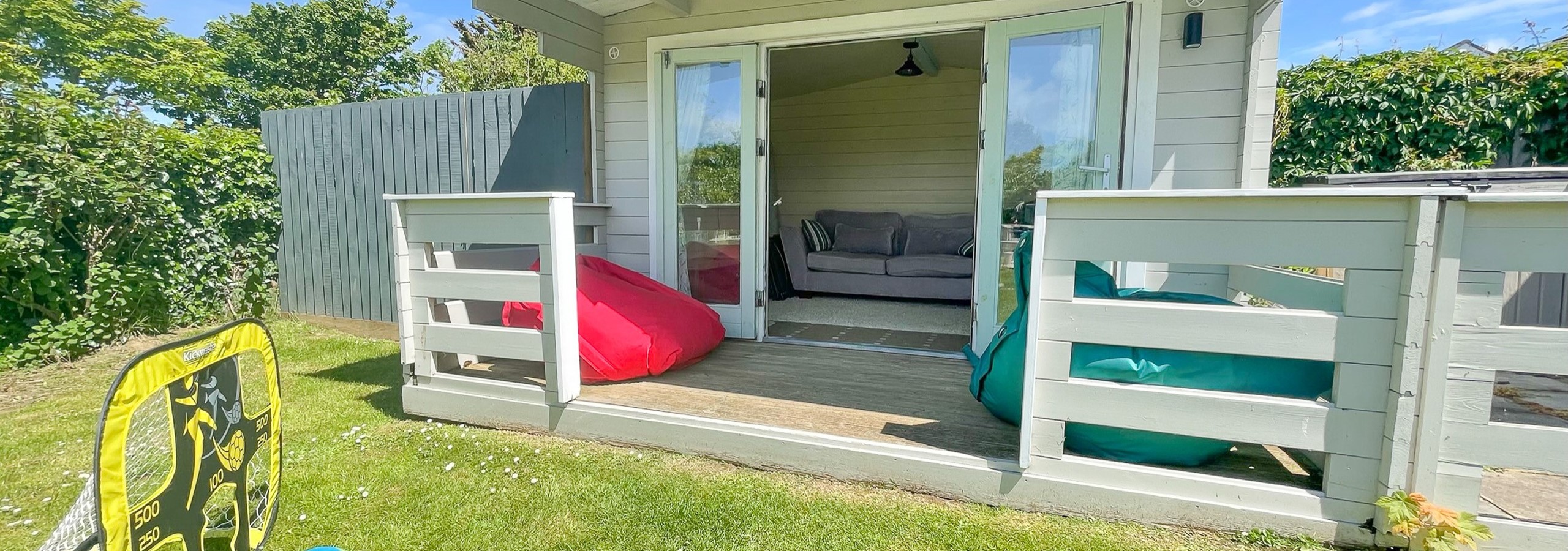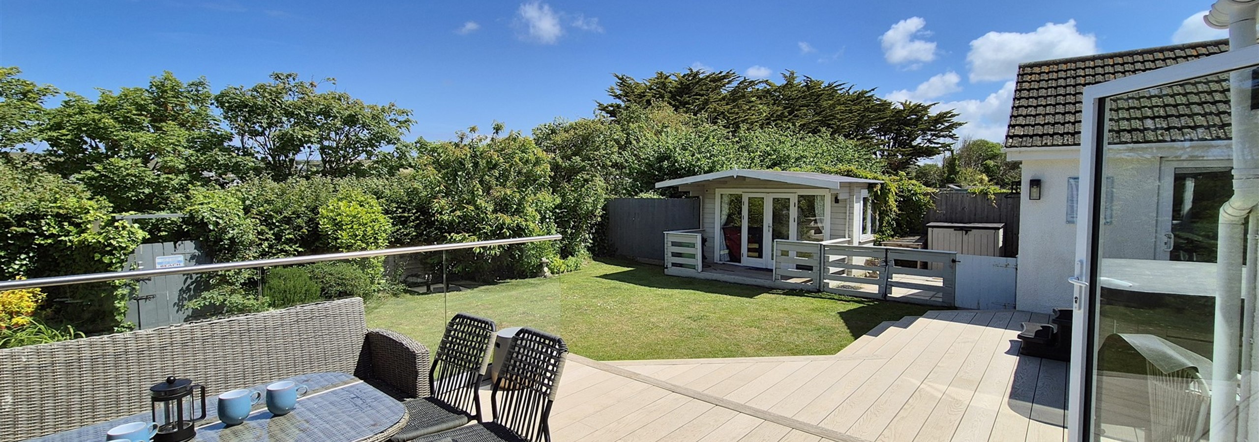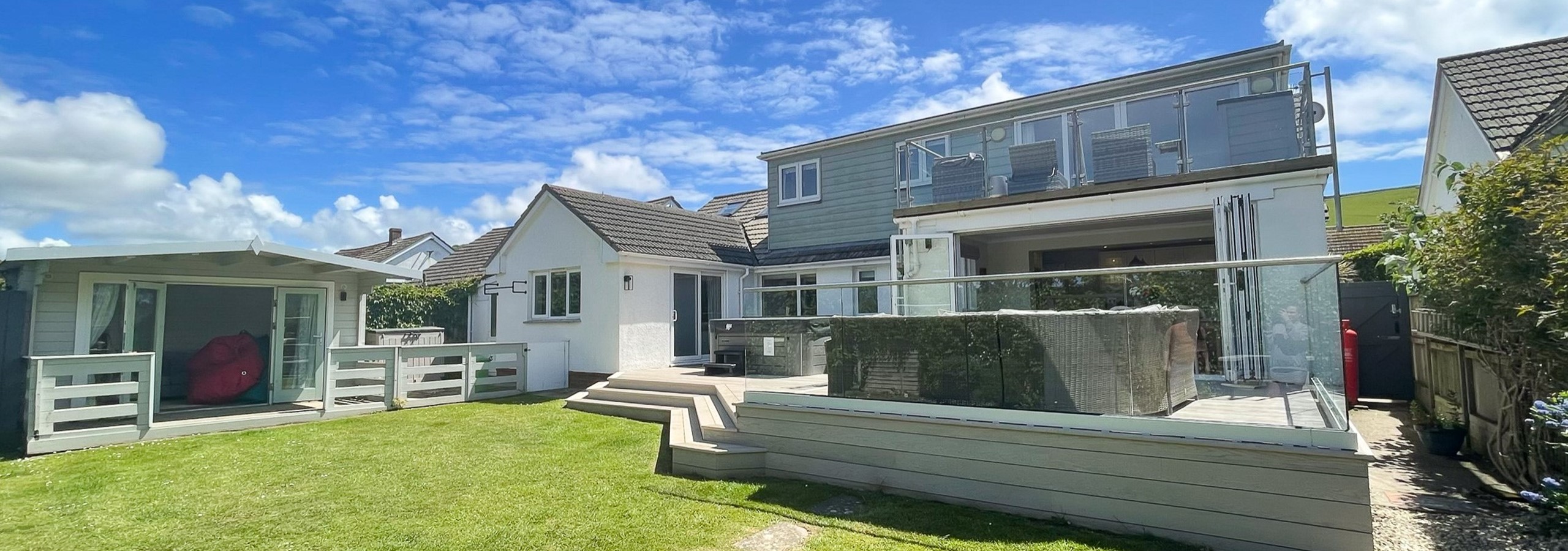 Exploring the garden at Sunny Sands will leave you 'wowed'! There is something here for every member of the family to enjoy - the hot tub (included in the price) which is well placed on the large composite decked terrace where there is also an outside corner sofa with table and extra stools - perfect for 'al-fresco' dining. A summer house with sofa and smart tv, purpose built charcoal Bushbeck BBQ (coal not provided), a good sized lawned area and secure gate which gives access to the footpath leading directly to the beach! The garden is fully enclosed for children and dogs and there is a wetsuit washing area with hanging rail for drying. To the front of the property there is ample driveway parking for at least 4 vehicles or more dependent upon the size of the vehicle and Sandy Way also has unrestricted roadside parking for residents and guests. The garden can be accessed from either side of the property, one side via a secure coded gate and the other via the board store/wet room. There is also a very large balcony accessed via the master bedroom which enjoys stunning views across Croyde, the surrounding countryside and towards the Dunes and Baggy Point.