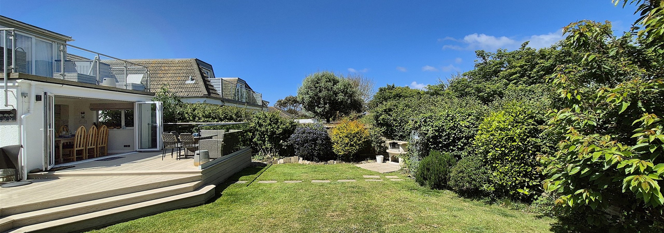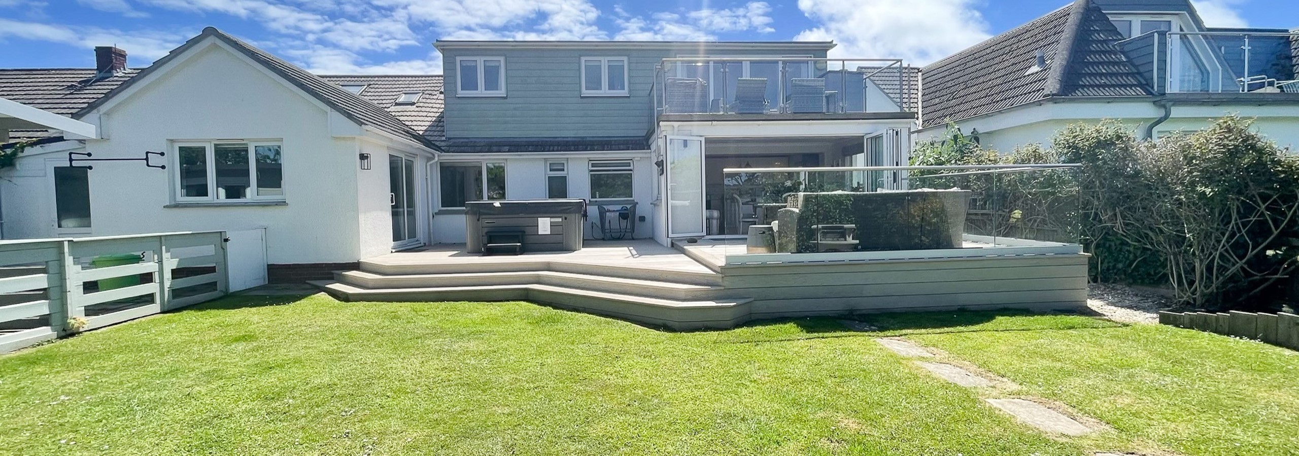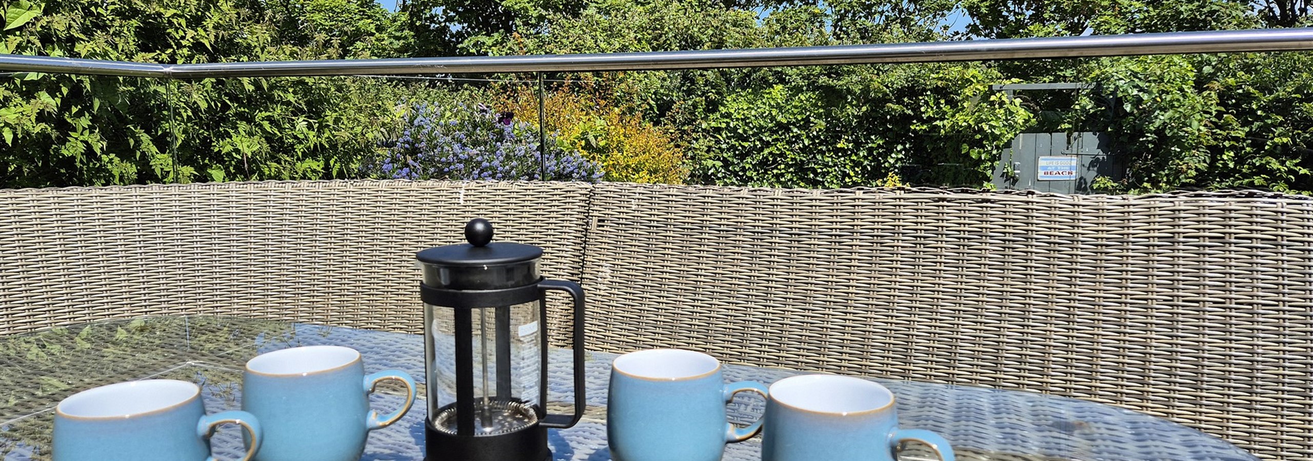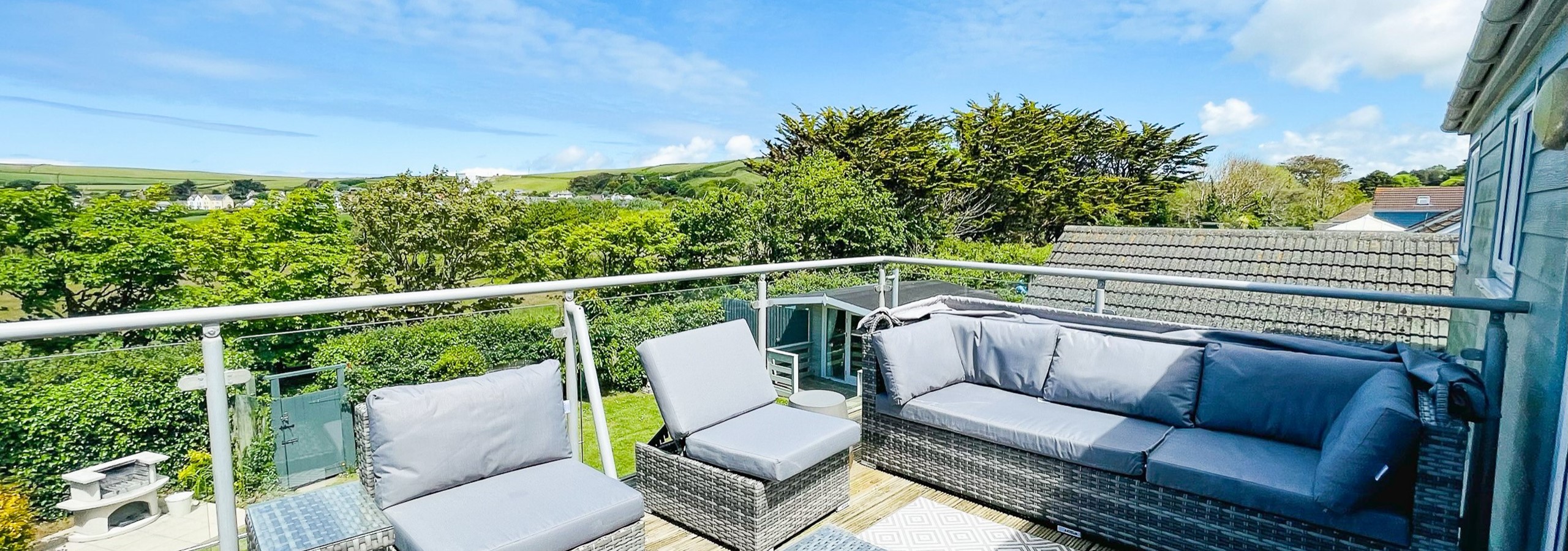 Exploring the garden at Sunny Sands will leave you 'wowed'! There is something here for every member of the family to enjoy - the hot tub (included in the price) which is well placed on the large composite decked terrace where there is also an outside corner sofa with table and extra stools - perfect for 'al-fresco' dining. A summer house with sofa and smart tv, purpose built charcoal Bushbeck BBQ (coal not provided), a good sized lawned area and secure gate which gives access to the footpath leading directly to the beach! The garden is fully enclosed for children and dogs and there is a wetsuit washing area with hanging rail for drying. To the front of the property there is ample driveway parking for at least 4 vehicles or more dependent upon the size of the vehicle and Sandy Way also has unrestricted roadside parking for residents and guests. The garden can be accessed from either side of the property, one side via a secure coded gate and the other via the board store/wet room. There is also a very large balcony accessed via the master bedroom which enjoys stunning views across Croyde, the surrounding countryside and towards the Dunes and Baggy Point.