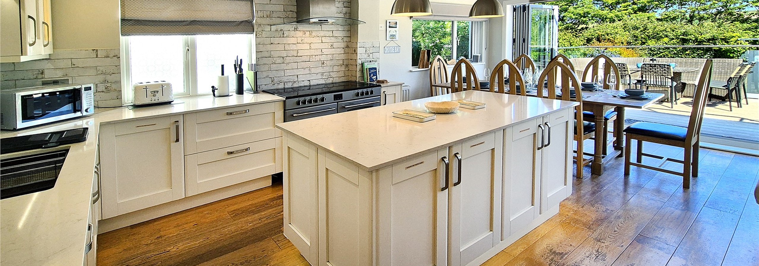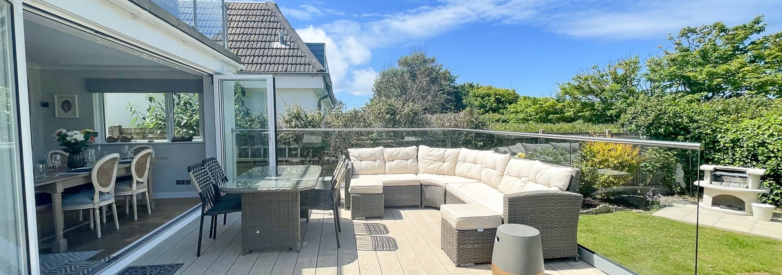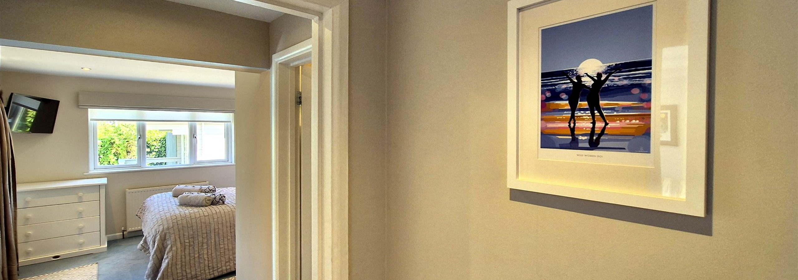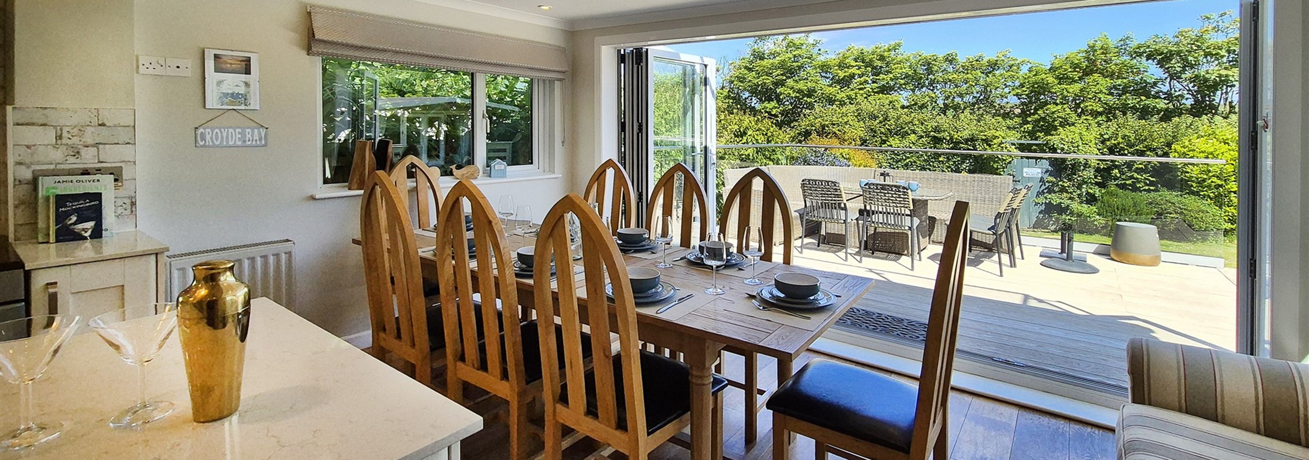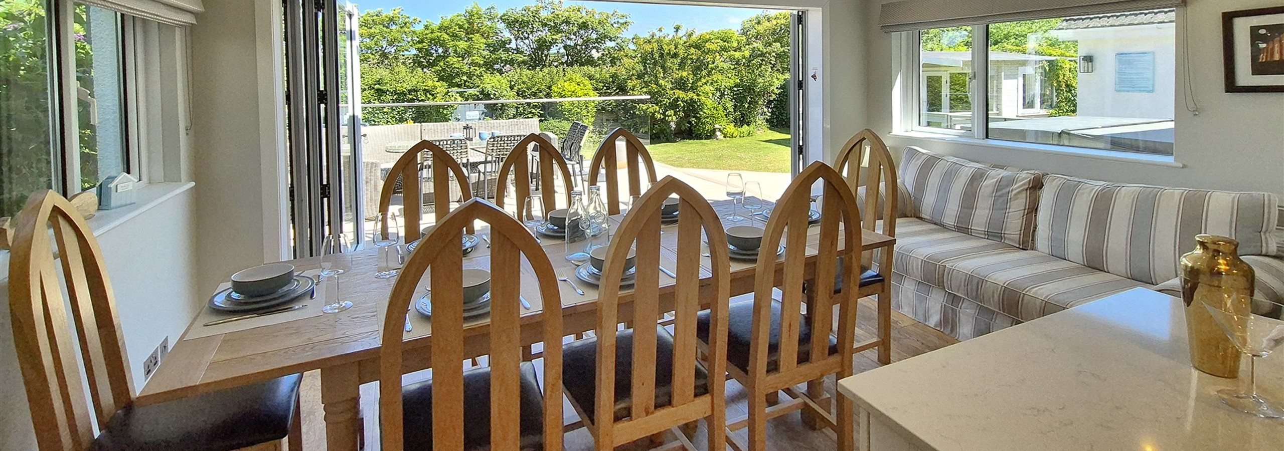 The beautiful kitchen/dining room has been given a recent revamp with new tiles, worktops and appliances. There is a 4-oven range cooker with gas hob, large American style fridge/freezer, Nespresso coffee machine, wine cooler and a dishwasher. New Denby crockery and Viners cutlery are provided and we are sure many nights around the large dining table (with seating for 10) will be enjoyed! Bi-fold doors open out on to the large composite decked area in the garden. There is a very useful utility area in the garage (which can be accessed from inside the property) where an extra fridge, sink, washing machine, tumble dryer and storage for bikes/beach equipment can be found. Also accessible from the utility/garage and with a door to the front drive, is a surfboard storage area which leads through to a wet room with access to the garden.