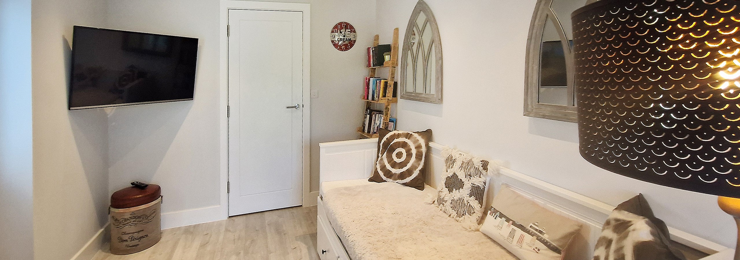 The rear of the garage now hosts a lovely garden room featuring a smart TV and a sofa bed that sleeps up to 2 guests (7th & 8th guest will be in this room should the party exceed 6). Past the first secure doorway, there's an external walkway leading to the front door of the property. Right across from the front door is the entrance to the garden room, however, keep in mind that to reach the garden room from the main property, you'll need to take two steps across the courtyard and through the front door. An electric radiator is installed in this room to keep the area to ensure your comfort.