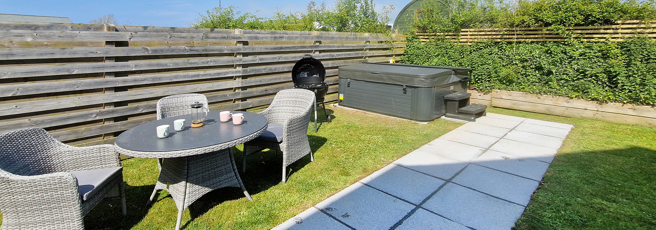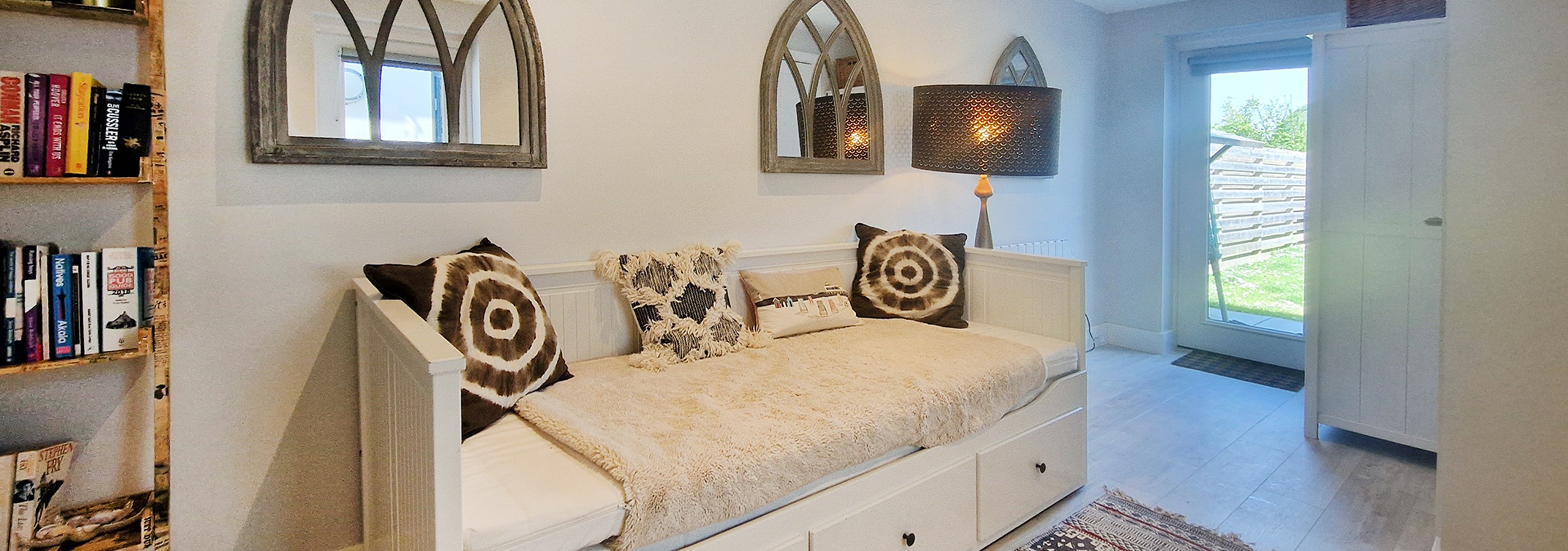The rear of the garage has been converted to a lovely garden/snug room with smart TV, sofa bed (for guests 7 & 8) and door leading out to the enclosed garden. Behind the first secure doorway to the property, you will find an external walkway which provides access to the front door and garden/snug room.