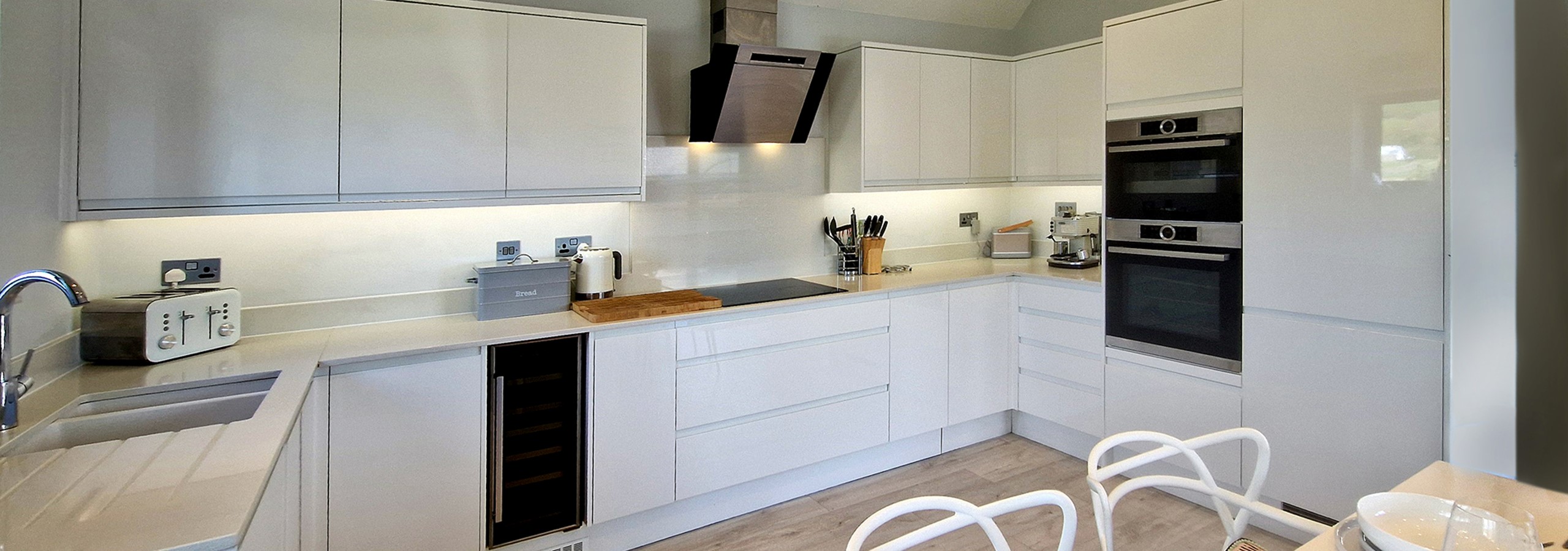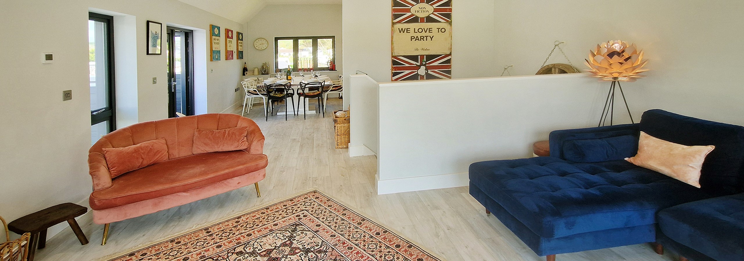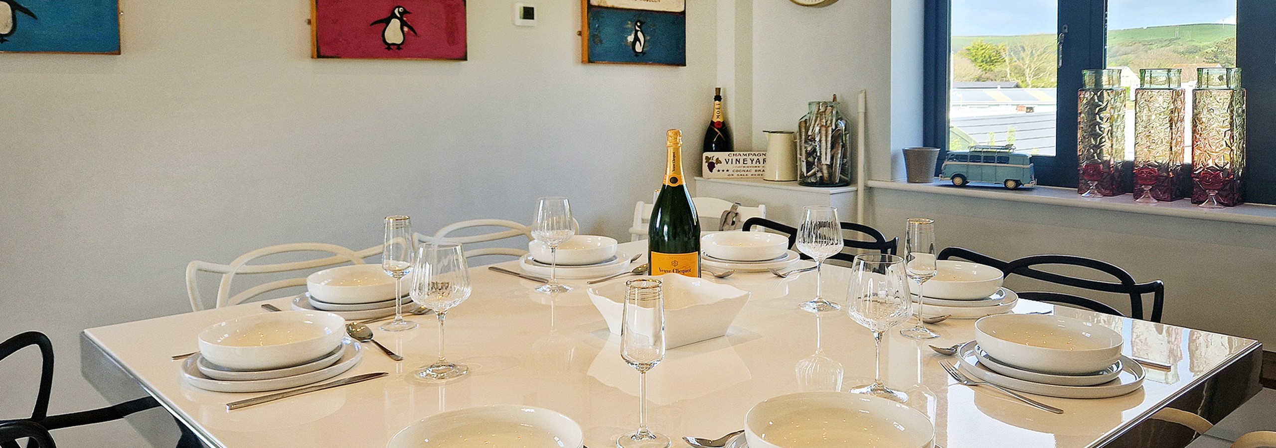 The kitchen space is beautifully designed and fitted with all the necessary appliances for a self-catered holiday (including a dishwasher, wine cooler, fridge/freezer, and induction hob). The top oven is a combination oven with a microwave setting. The dining area has seating for 6-8 guests.