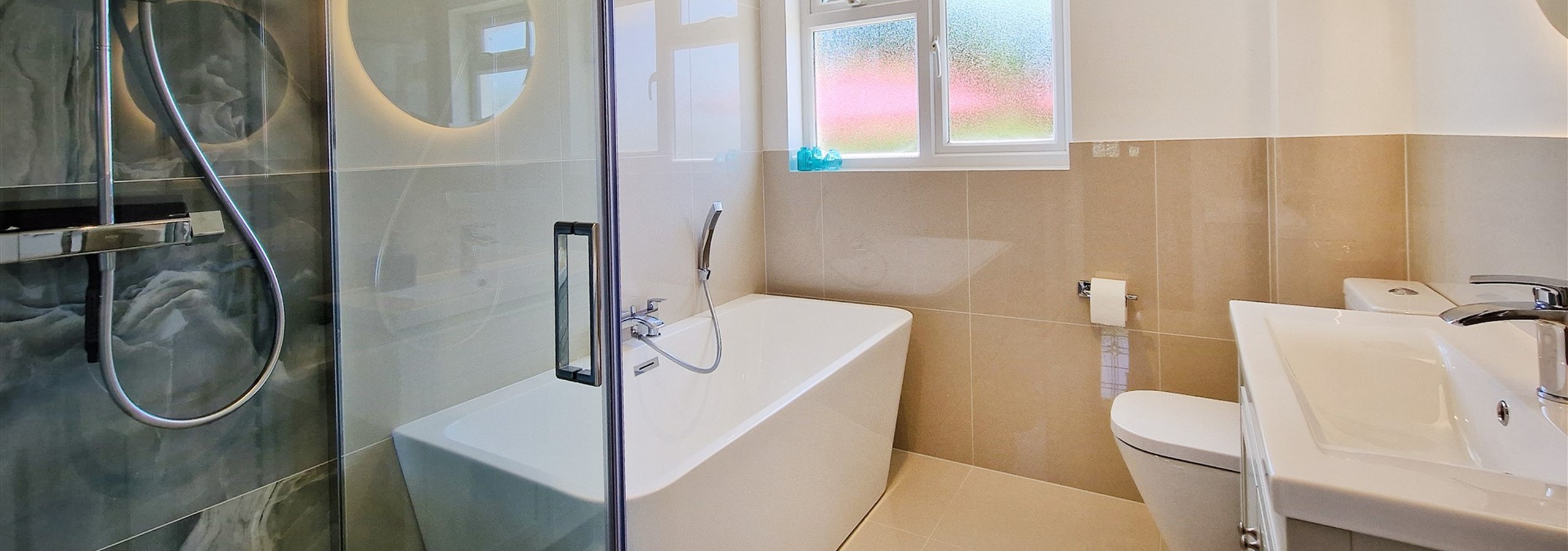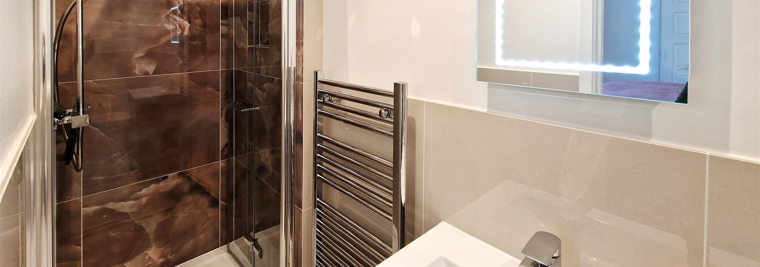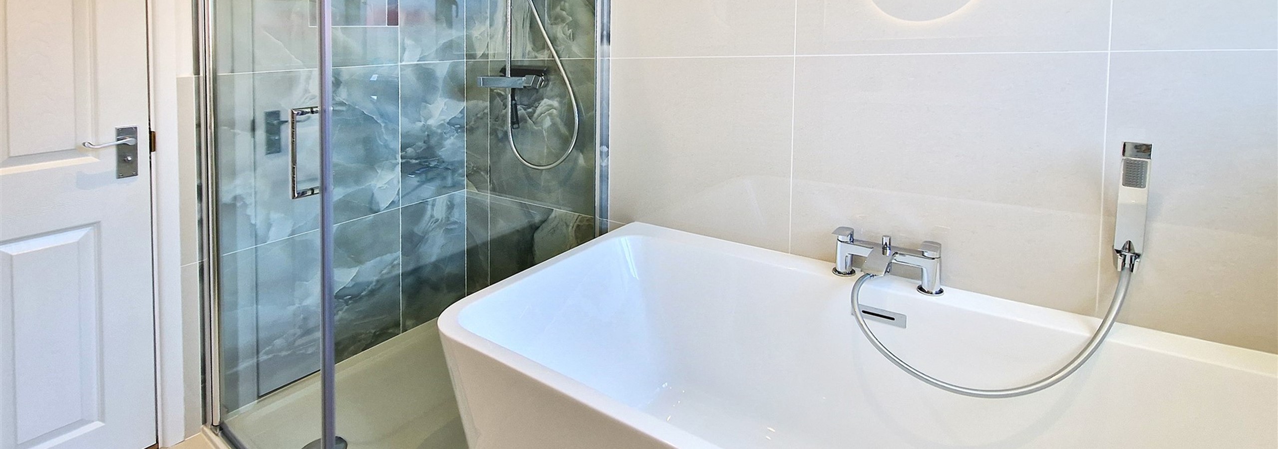 There is a fresh, modern family bathroom with bath, walk-in shower, wash basin and w/c. The master bedroom has an en-suite shower room, with w/c and wash basin.