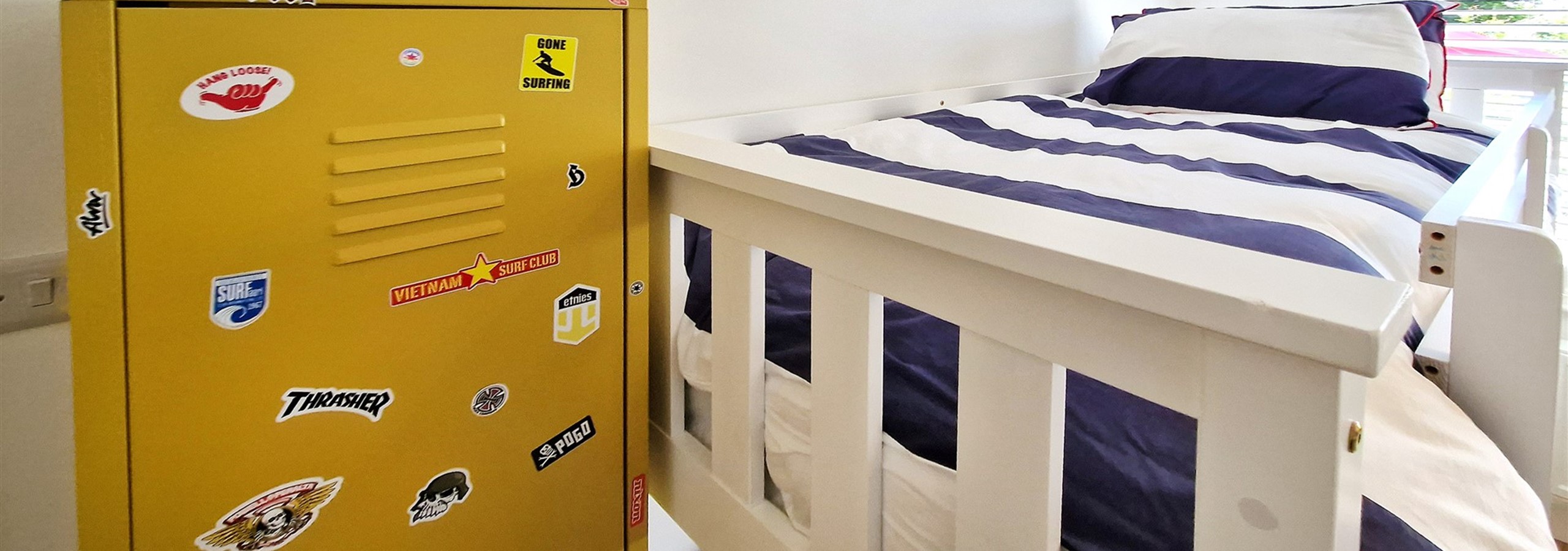 The second bedroom boasts a king size bed, hard wood floors, dresser, and wardrobe. The final bedroom has two sets of bunk beds sleeping 4 people, three of the beds are standard singles, suitable for children or adults. One of the 4 beds is a double size but will only be suitable for one person.