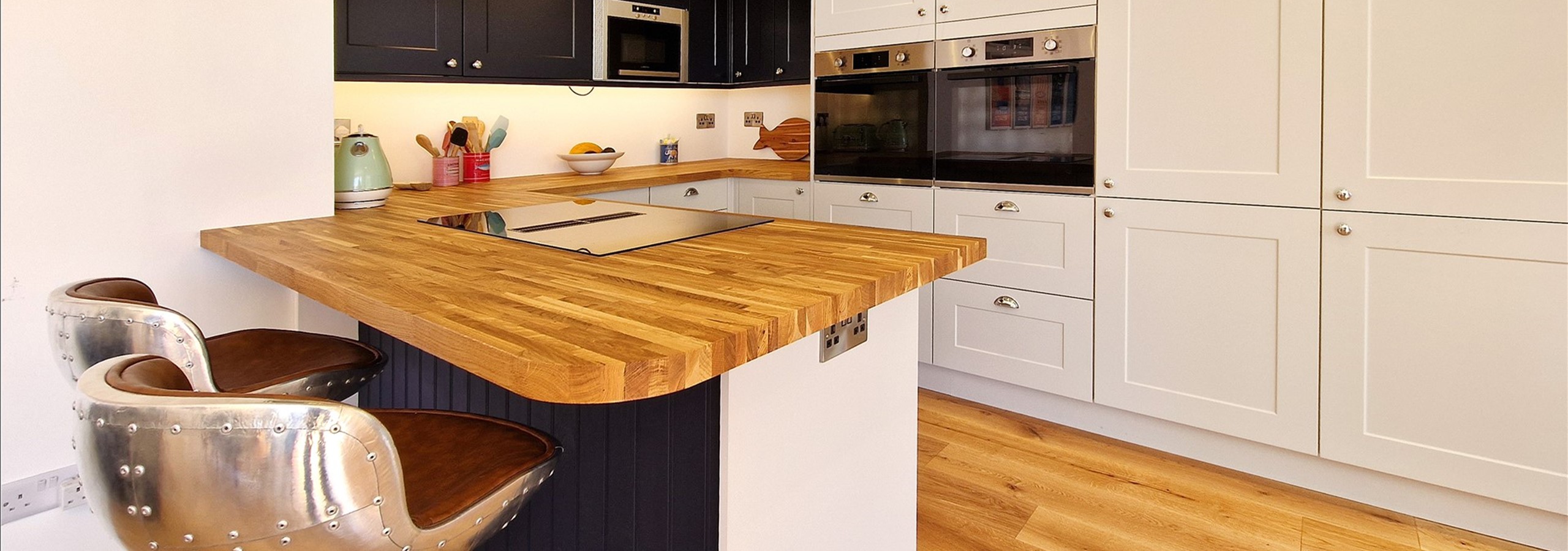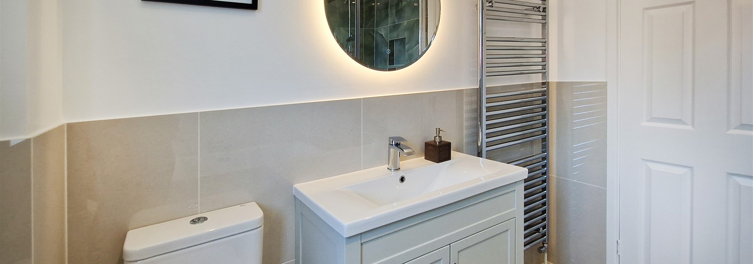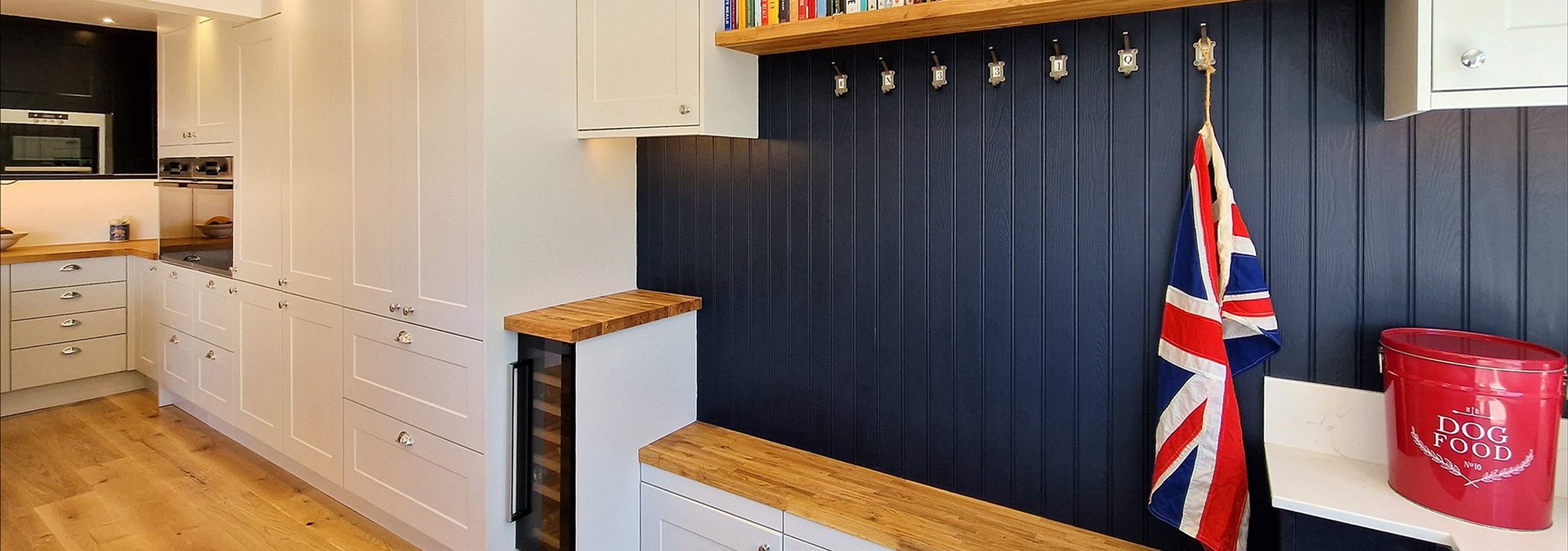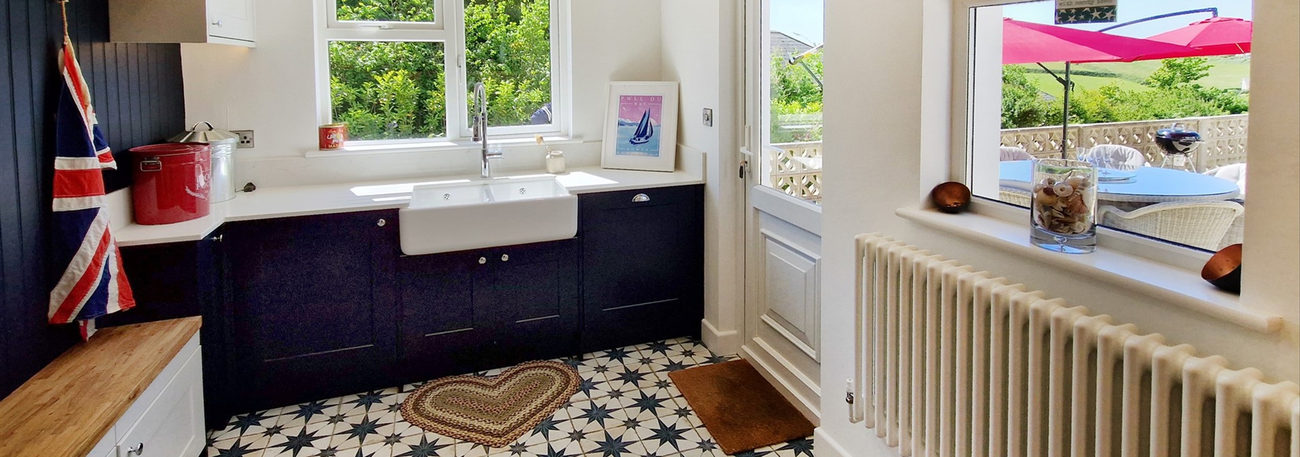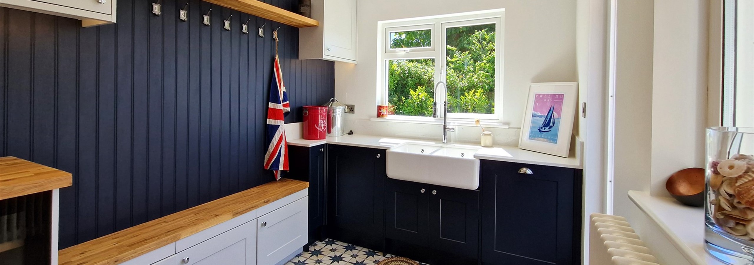 Off the kitchen is a modern utility area with butler sink, boot bench and separate access to the garden patio.