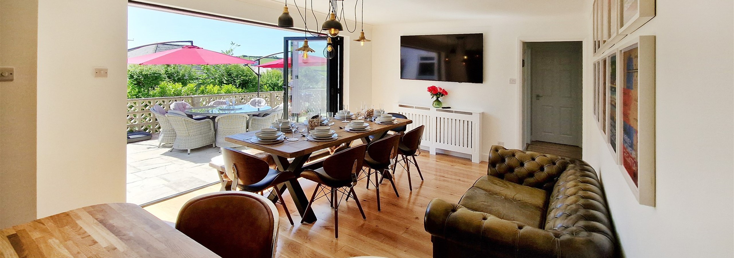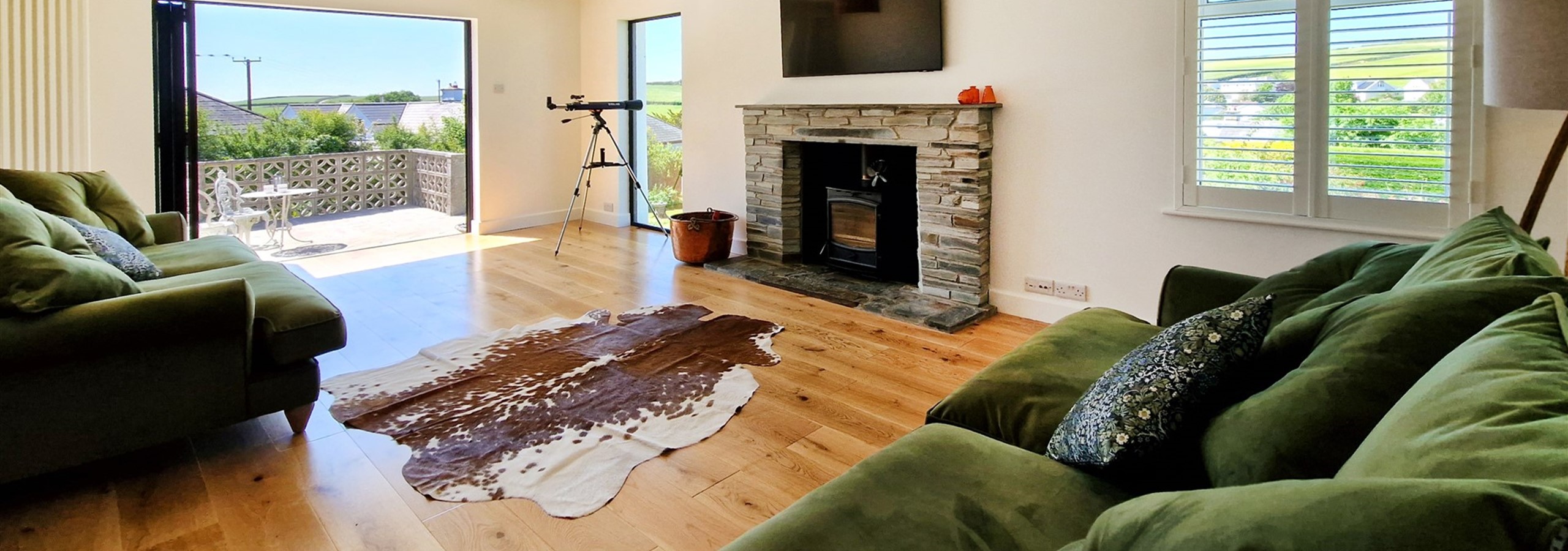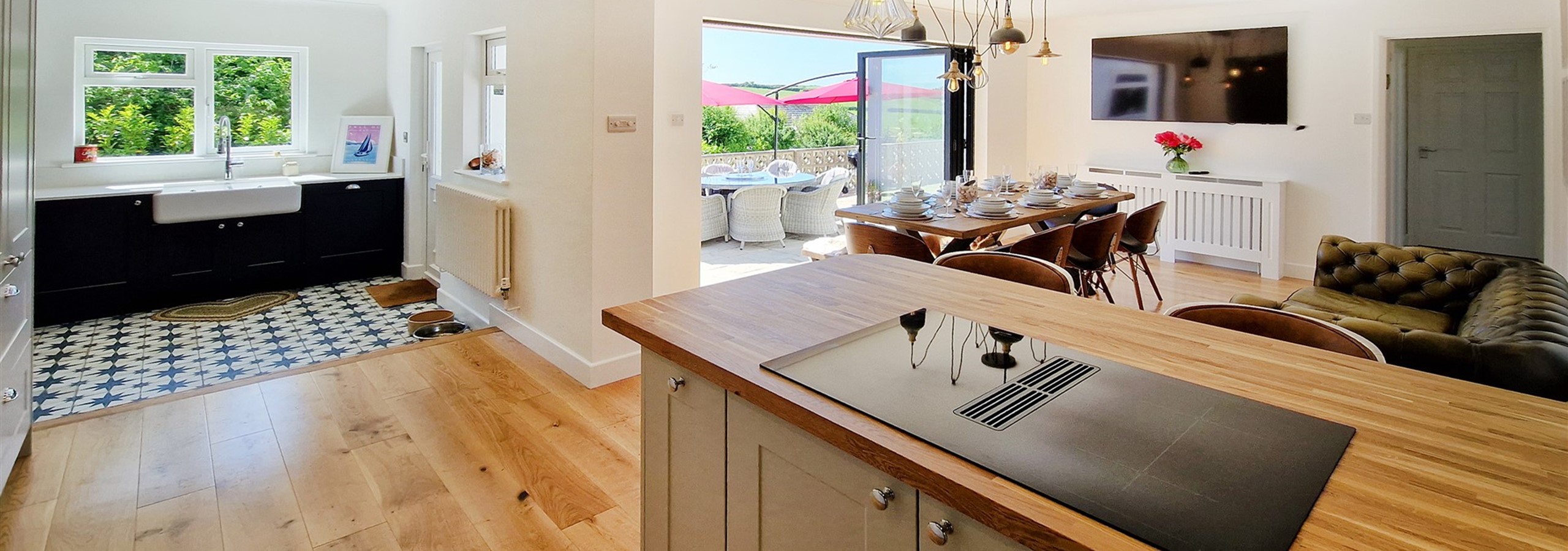 Completely renovated in 2023, the open plan kitchen/living dining room provides a lovely space for relaxing and entertaining the family. A large Smart TV is provided in the lounge along with wood burner and even a telescope. Bi-fold doors lead onto an expansive terrace with views over the lawned gardens and Georgeham hills. Both the lounge and dining table have ample comfortable seating for the full occupancy of the property. The kitchen is well equipped with integrated oven, microwave, fridge, freezer, and dishwasher. A separate wine cooler is provided. There is a breakfast bar with stylish seating for 2.