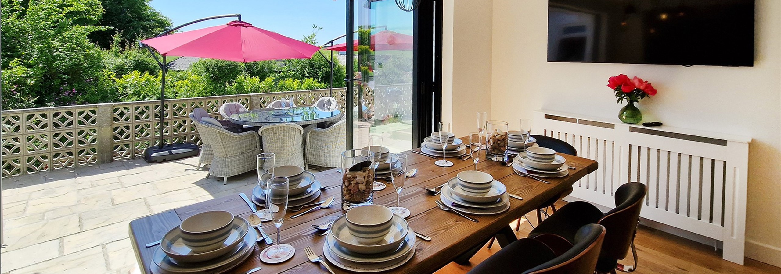 From the living area, bifold doors lead to the large patio where there is an outside table (seating 8 people), parasol, and further seating for two on a smaller table and chairs. Steps down from the patio access the large, fully enclosed lawned garden. There is a coal BBQ in the garden (coal not provided).