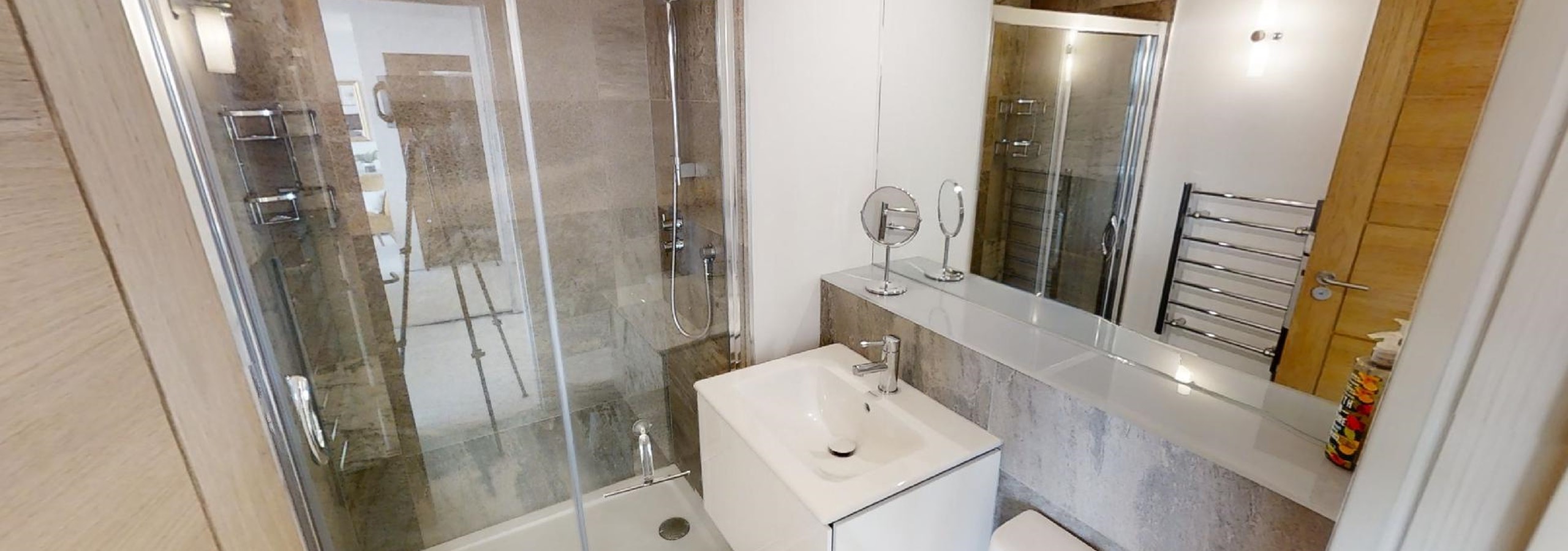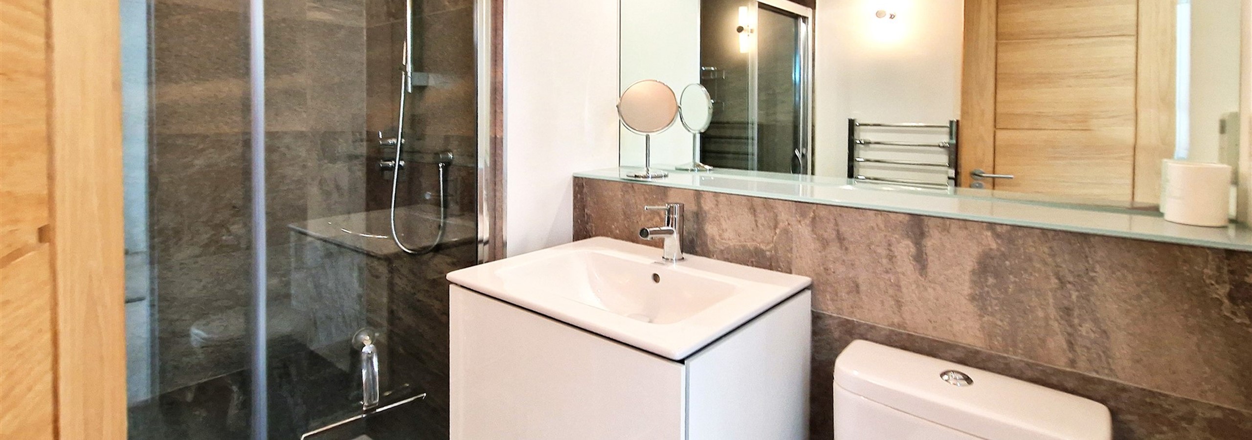 There is a family bathroom with shower over the bath plus en-suite shower room to the master. A separate wc is also available downstairs, off the living room. There is a communal outdoor shower for washing off after the beach, located in the underground parking area.
