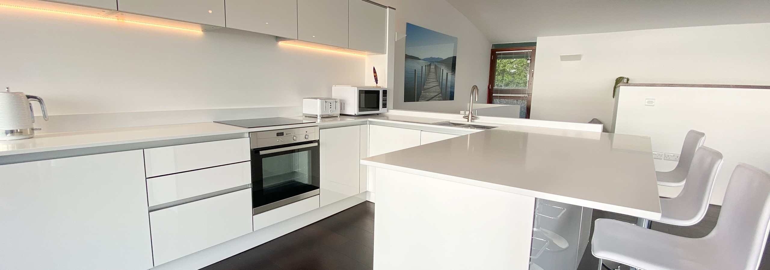 The main living accommodation is modern and open plan with kitchen appliances including built in dishwasher, washing machine, oven, hob & an array of kitchen essentials. There is a breakfast bar area with stools and dining table with seating for 8. The living area provides comfortable seating for 8 (including a sofa bed, additional charges apply), Smart TV and access to the balcony where there is a small bistro table and chairs.