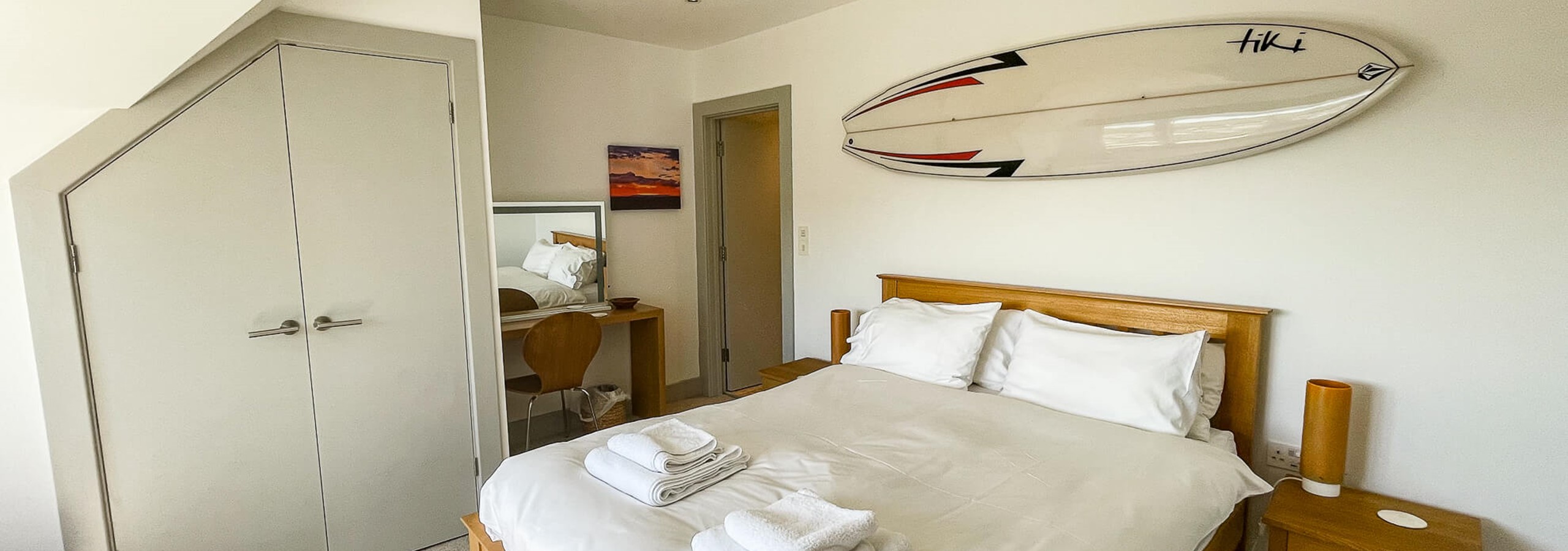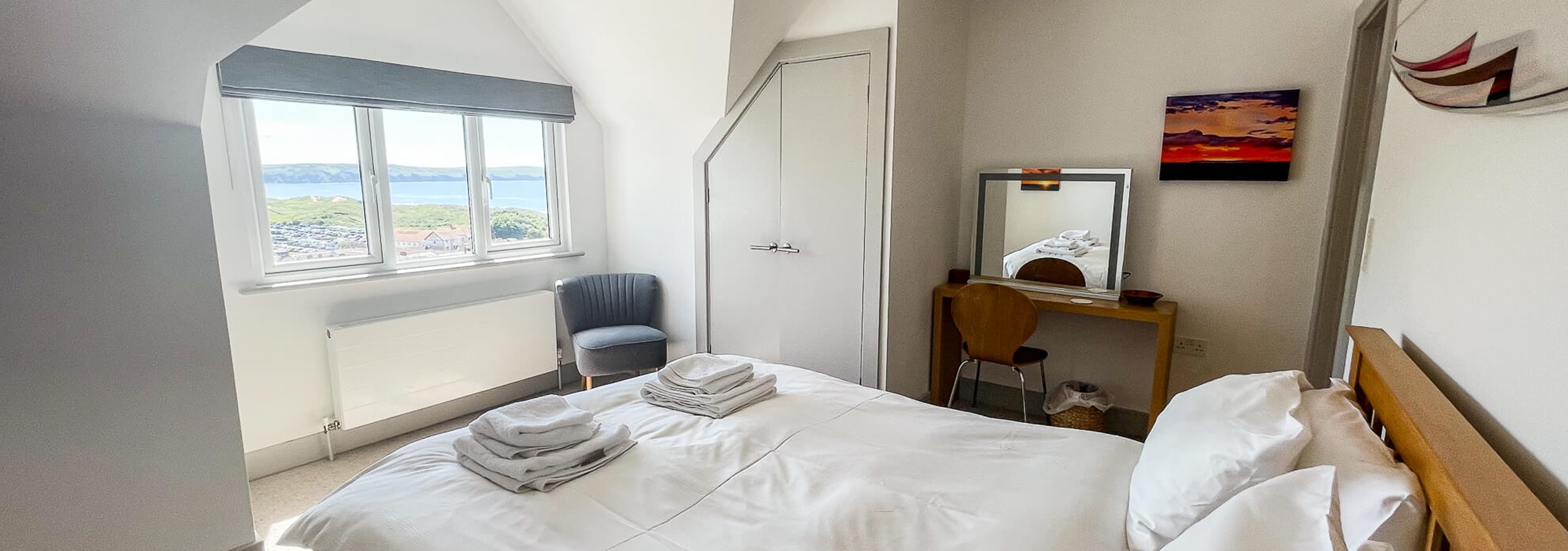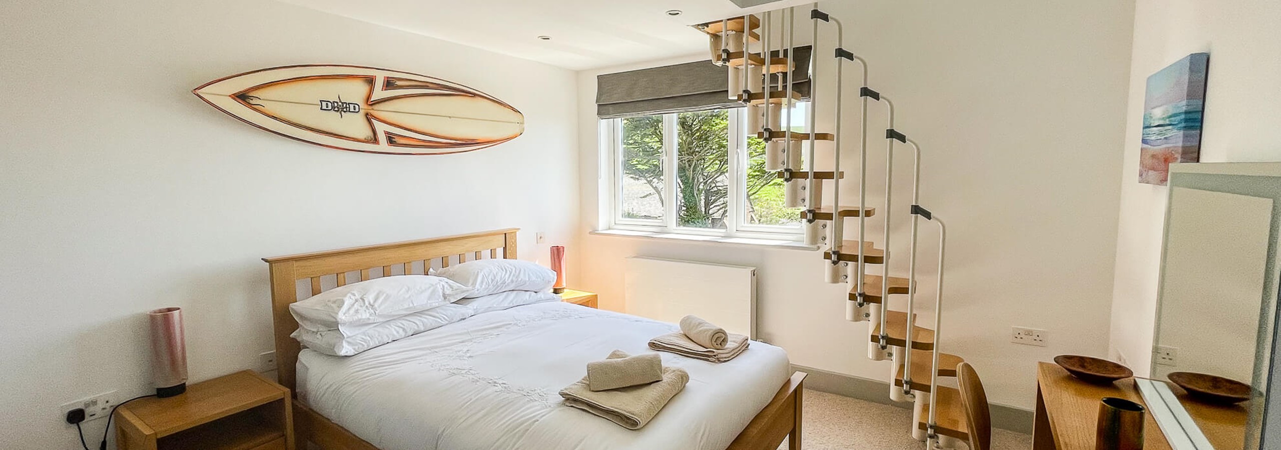 There are 3 bedrooms in Longbeach House sleeping up to 6 guests. The Master Bedroom is a spacious room with a double bed and an en-suite shower room, mezzanine floor and views over the garden, Woolacombe and towards the sea.