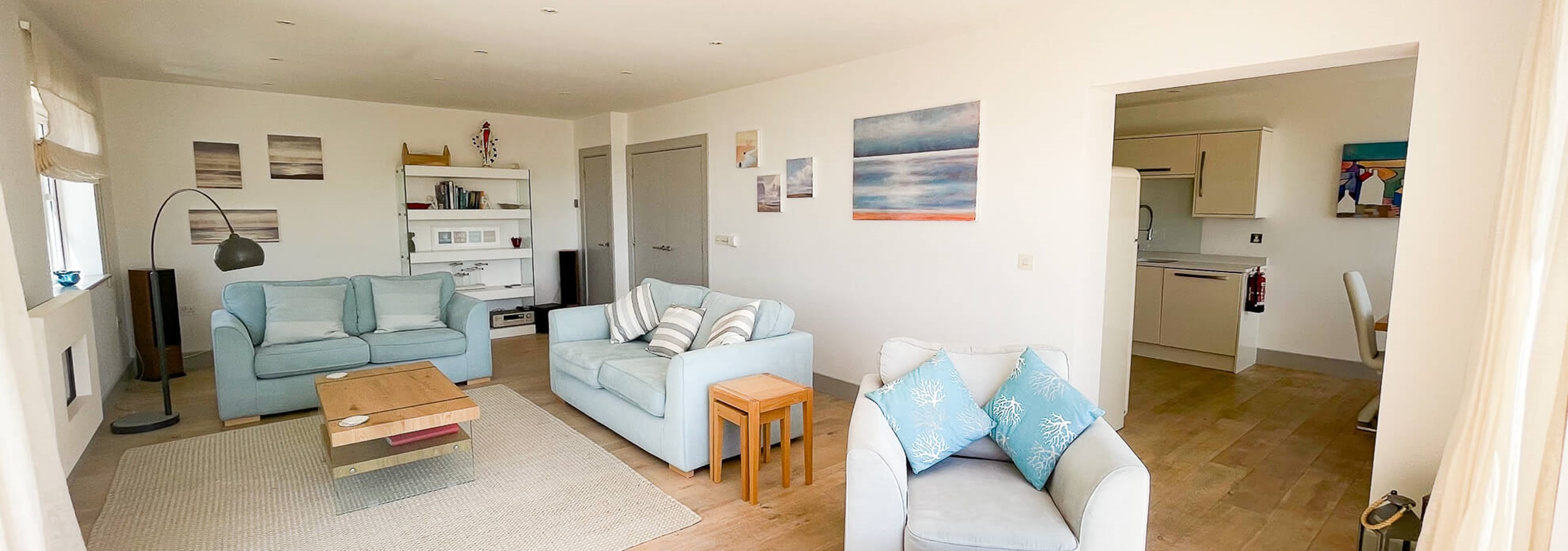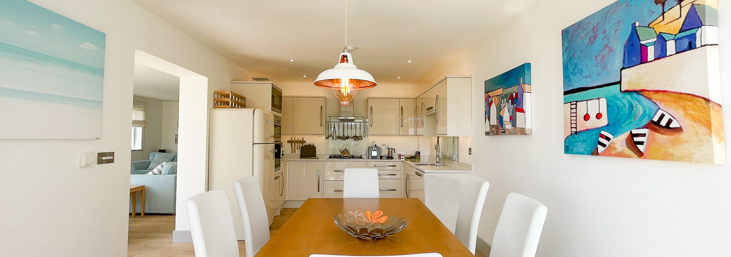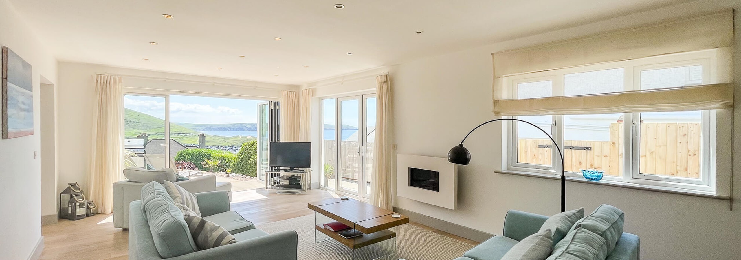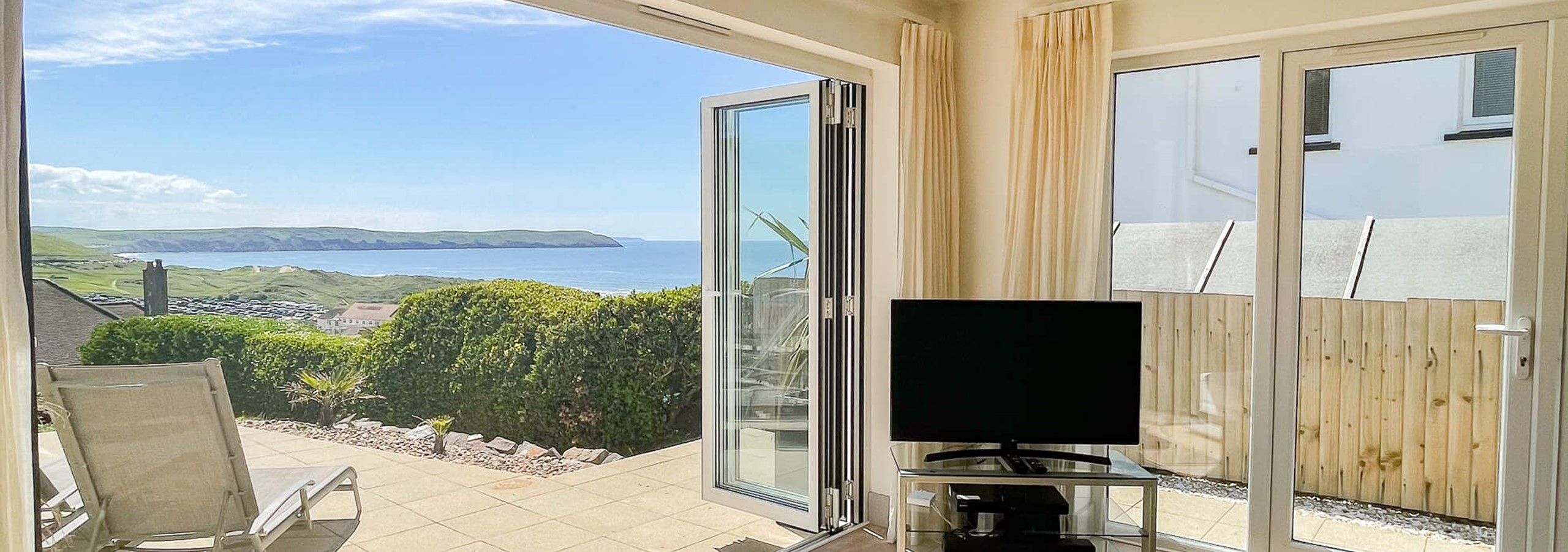 The spacious, dual aspect living room has bi-fold doors leading out to the terrace and garden and enjoys fabulous views across Woolacombe and giving stunning views of the beach, sea, and countryside. There is comfortable seating for 6 people, a wall mounted electric fire provides a nice ambience and some heat for the cooler evenings, a Smart TV, Apple TV and fast unlimited secure broadband are all provided.