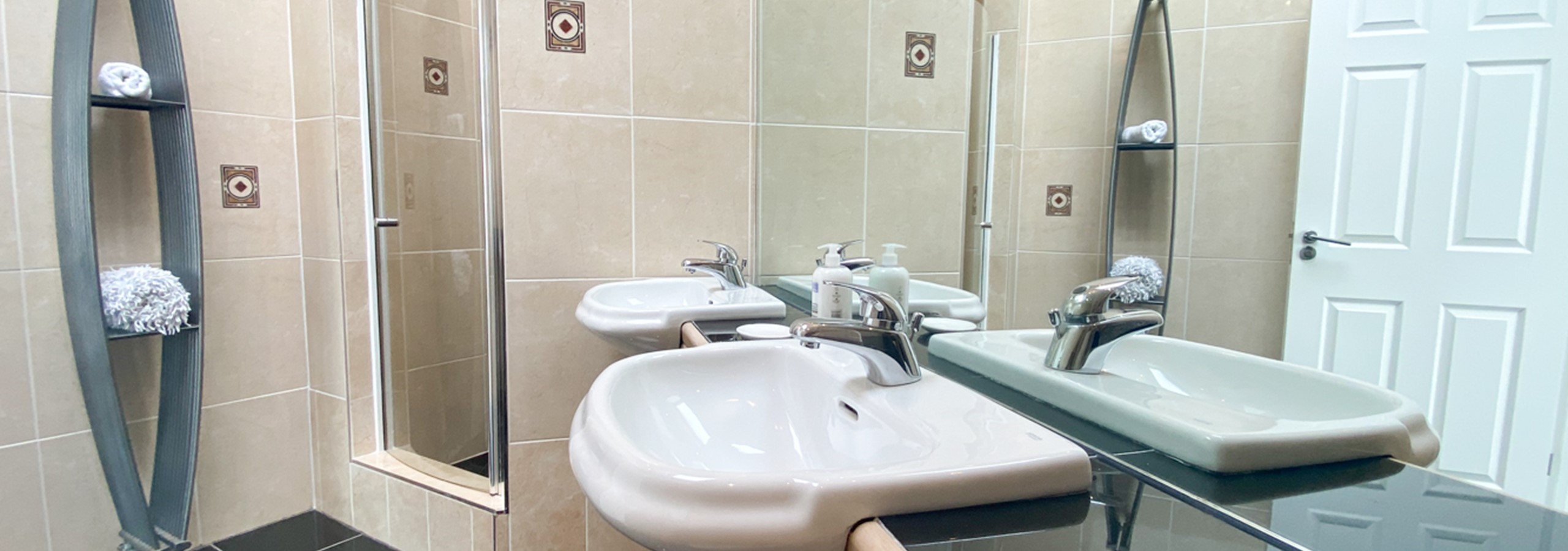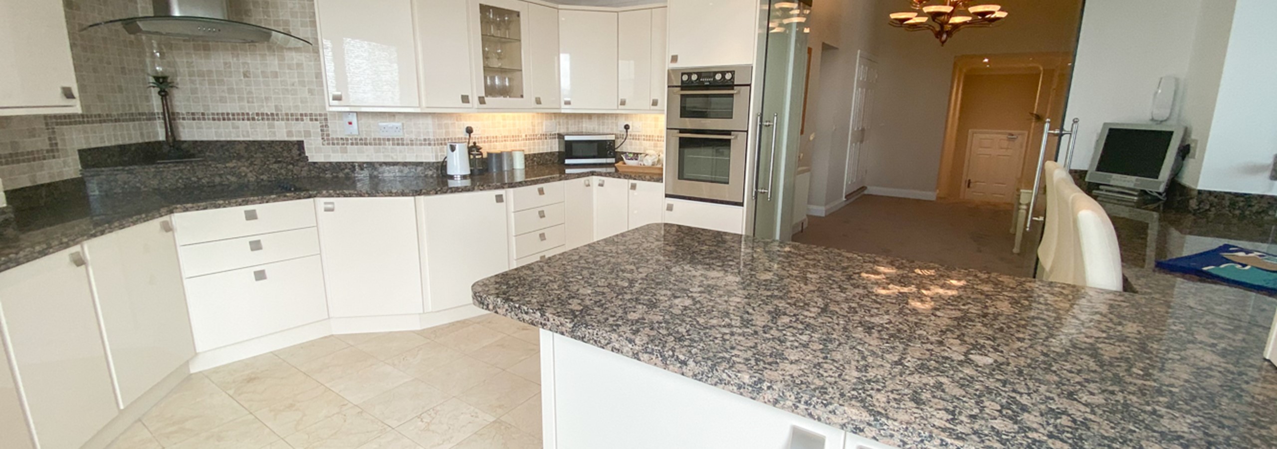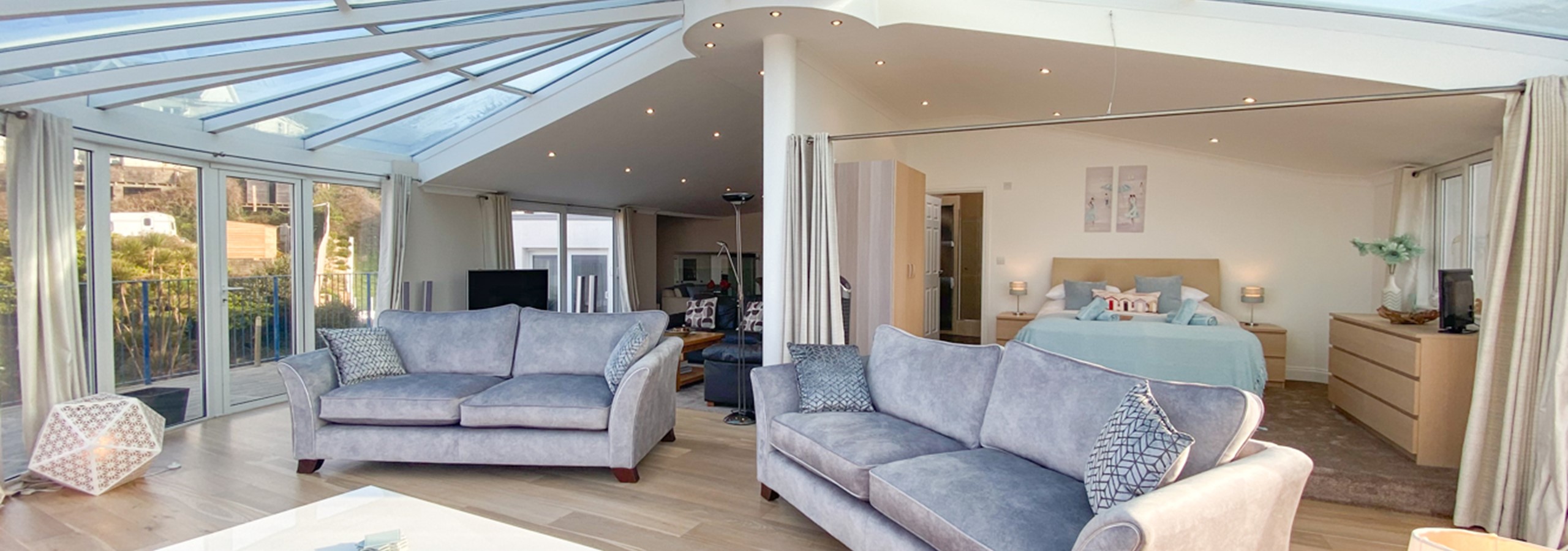 The master bedroom is positioned on a slightly raised area off the living room, separated by heavy curtaining, making it possible to wake up in the morning to this wonderful outlook over the beaches and listen to the sound of the sea! There is an extremely attractive fully tiled en-suite shower room with dual sinks and spacious shower.