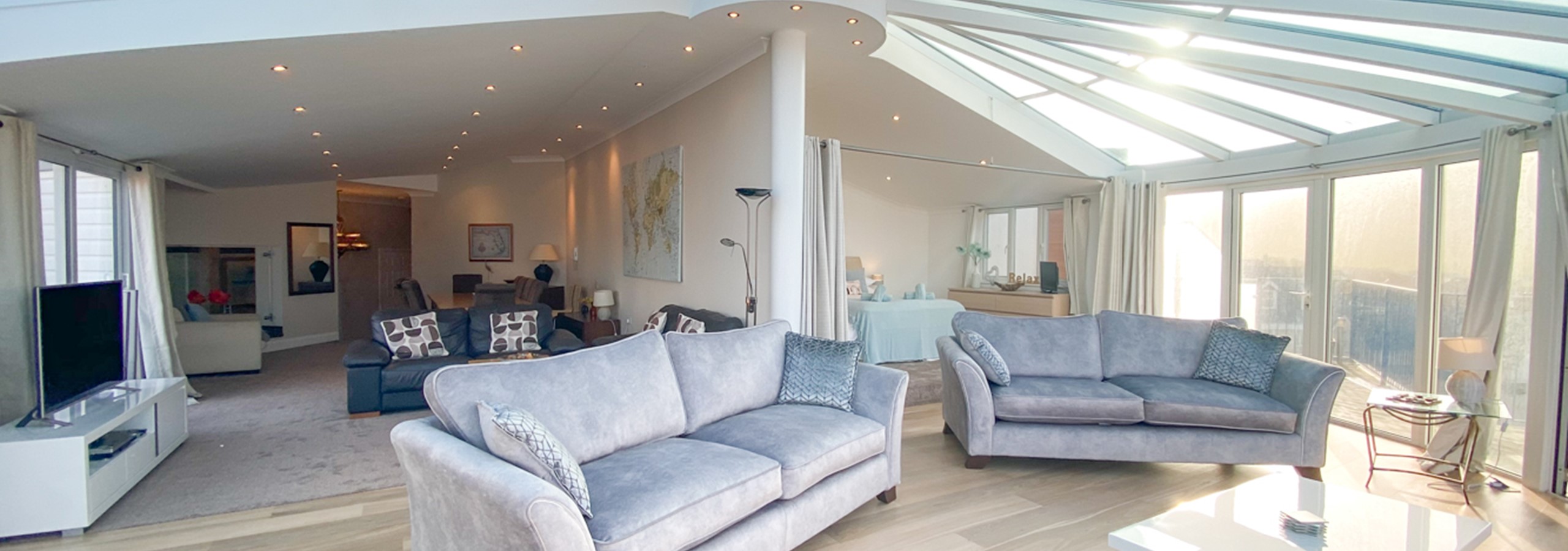 The apartment has a fabulous open plan feel, with well equipped kitchen, breakfast bar and French doors leading to onto the wrap around terrace. A few steps lead up to a large dining/living area (seating 10) with huge glazed area and bi-fold doors.